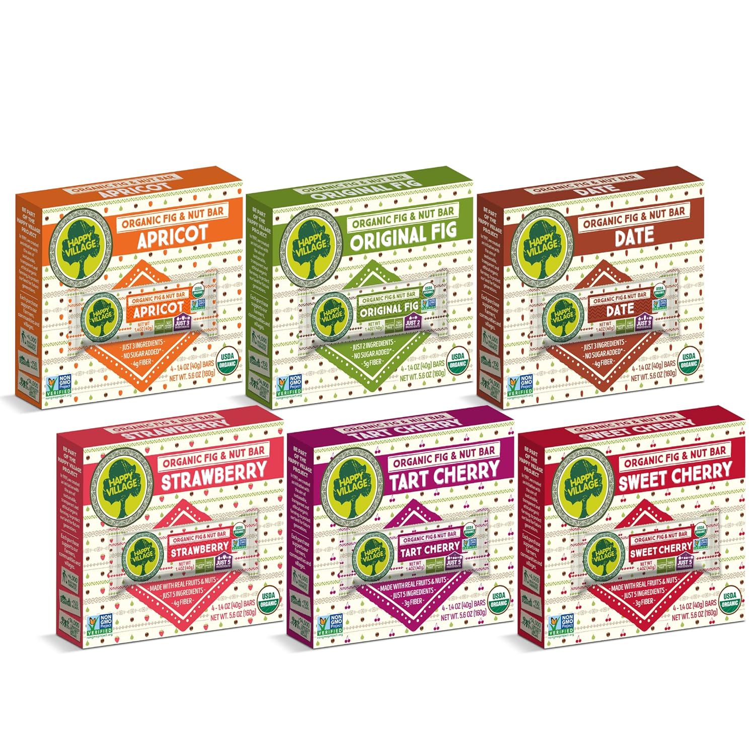 Happy Village Organic Fig & Nut Bars, VARIETY (24 Pack, 1.4 OZ each), Gluten Free, No Refined Sugar, Kosher, Non-GMO, Vegan, Good Source of Fiber, Organic Healthy Snack Bars - 4 bars of Each Flavor
