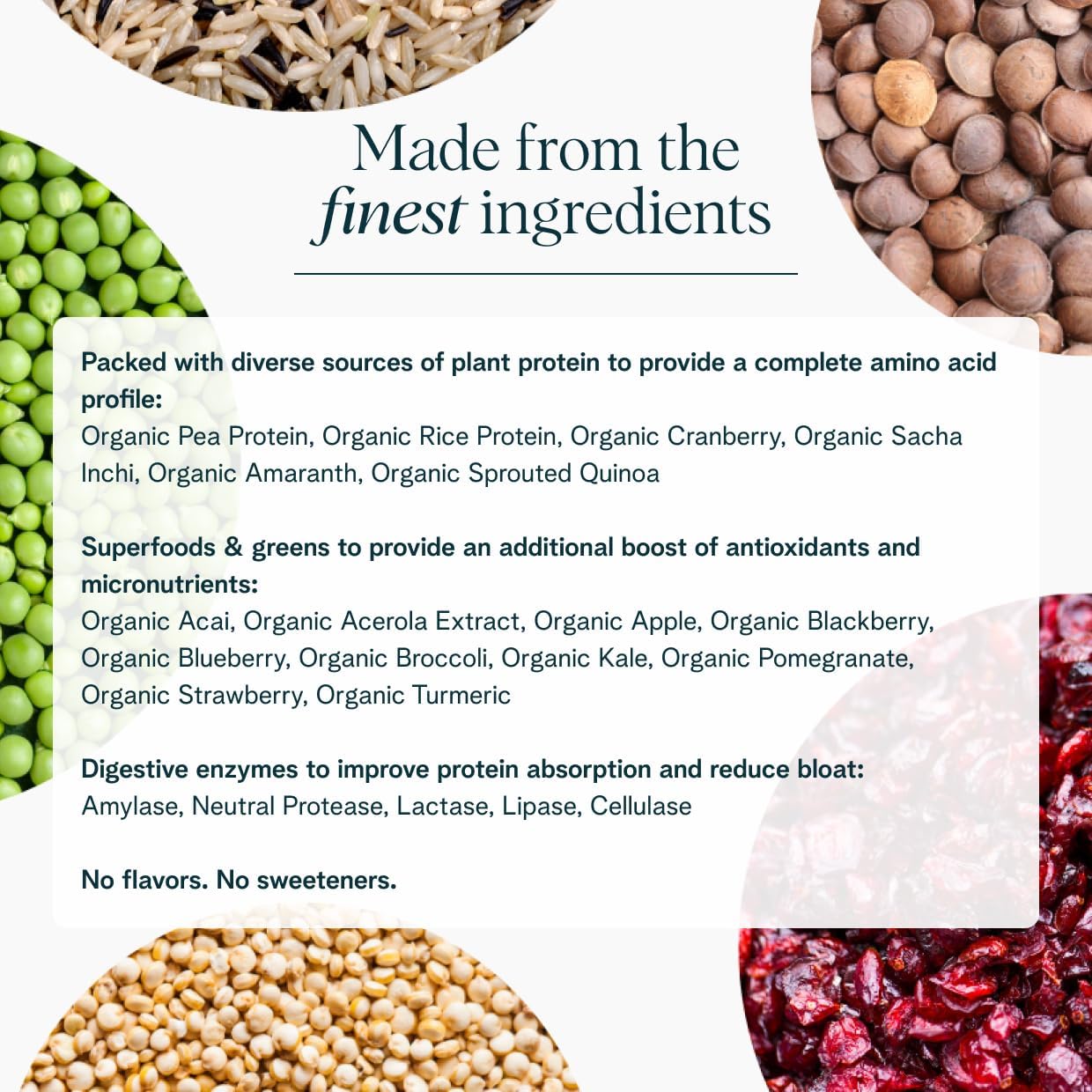 - COMPLETE AMINO ACID PROFILE: We blend a variety of protein sources to ensure a balanced and complete amino acid profile for optimal lean muscle building. We source the best whole-food, non-GMO ingredients sourced from USDA Organic certified farms. Free from erythritol, gluten, dairy, fillers, sugar, and artificial ingredients. Heavy metal tested.