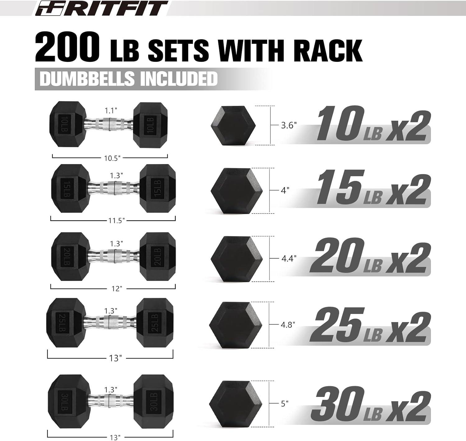 - Sets Included: This package contains a pair of 10LB, 15LB, 20LB, 25LB, 30LB Dumbbells with 1 X 5-Tier Rack. Designed to store most sizes of dumbbells, the RITFIT Dumbbell Rack is ideal for your home gym setup to keep your training space organized.