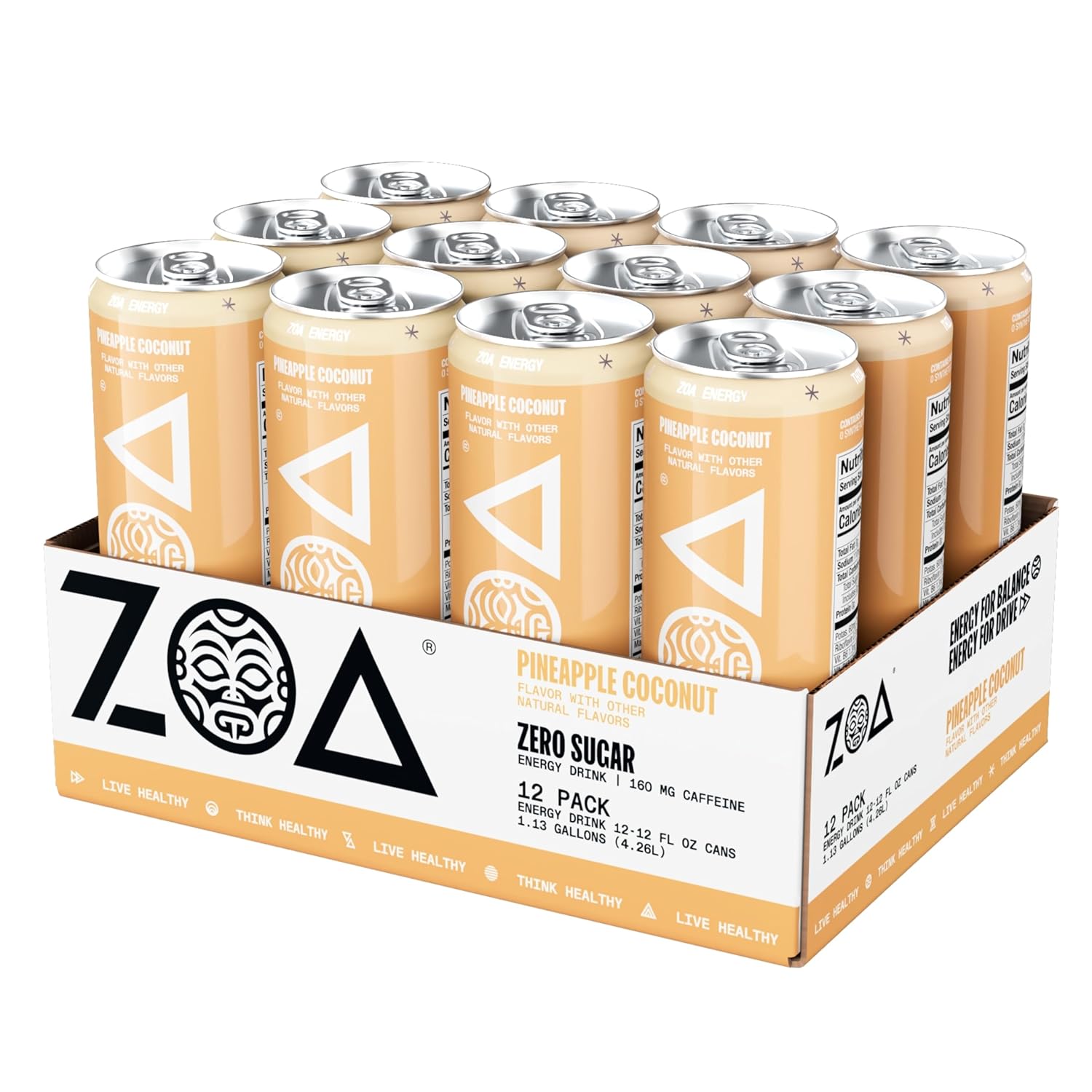 ZOA Zero Sugar Energy Drinks, Pineapple Coconut - Sugar Free with Electrolytes, Healthy Vitamin C, Amino Acids, Essential B-Vitamins, and Caffeine from Green Tea - 12 Fl Oz (12-Pack)