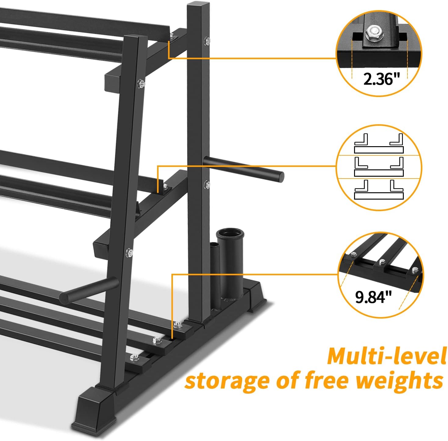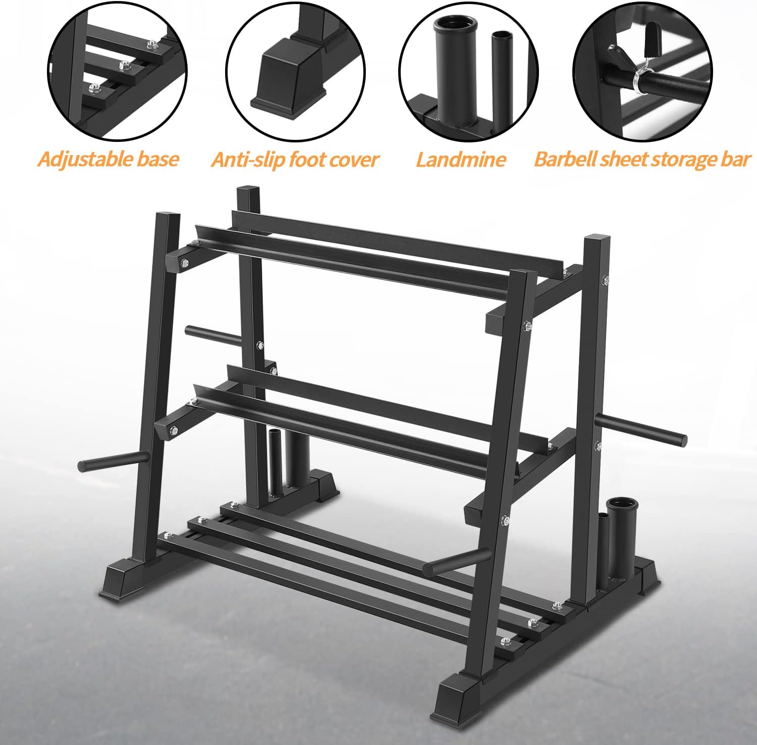 - 【Multi-functional Storage】:The weight storage rack is equipped with a 3-tier dumbbell storage rack and four barbell storage bars. Not only can you store a variety of dumbbells, but there are also dedicated storage locations for kettlebells, barbells and barbell plates.