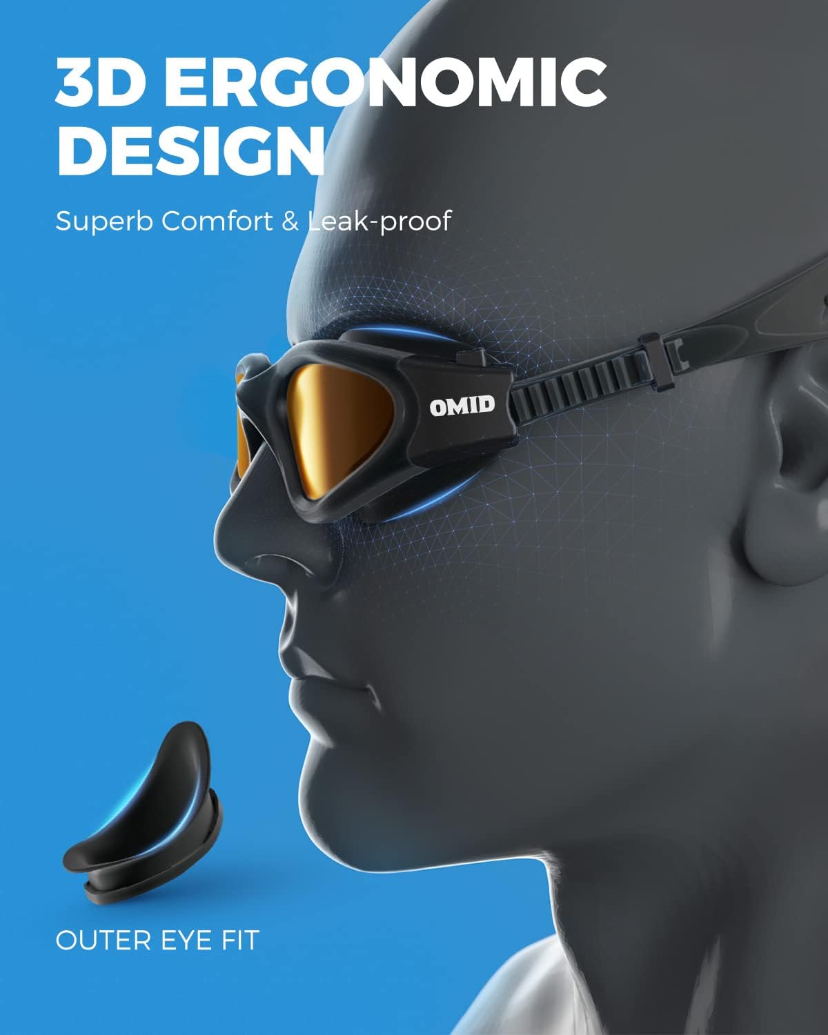 - 【Professional Leak-proof & UV Protection】Our swimming goggles for men designed with Ergonomic 3D frame ensures a perfect fit and never allows water leak in. In order to protect your eyes from irritation. OMID swim goggles are constructed with 111% UV protection to filter out harmful rays, which will bring you worry-free, crystal clear swims every time.