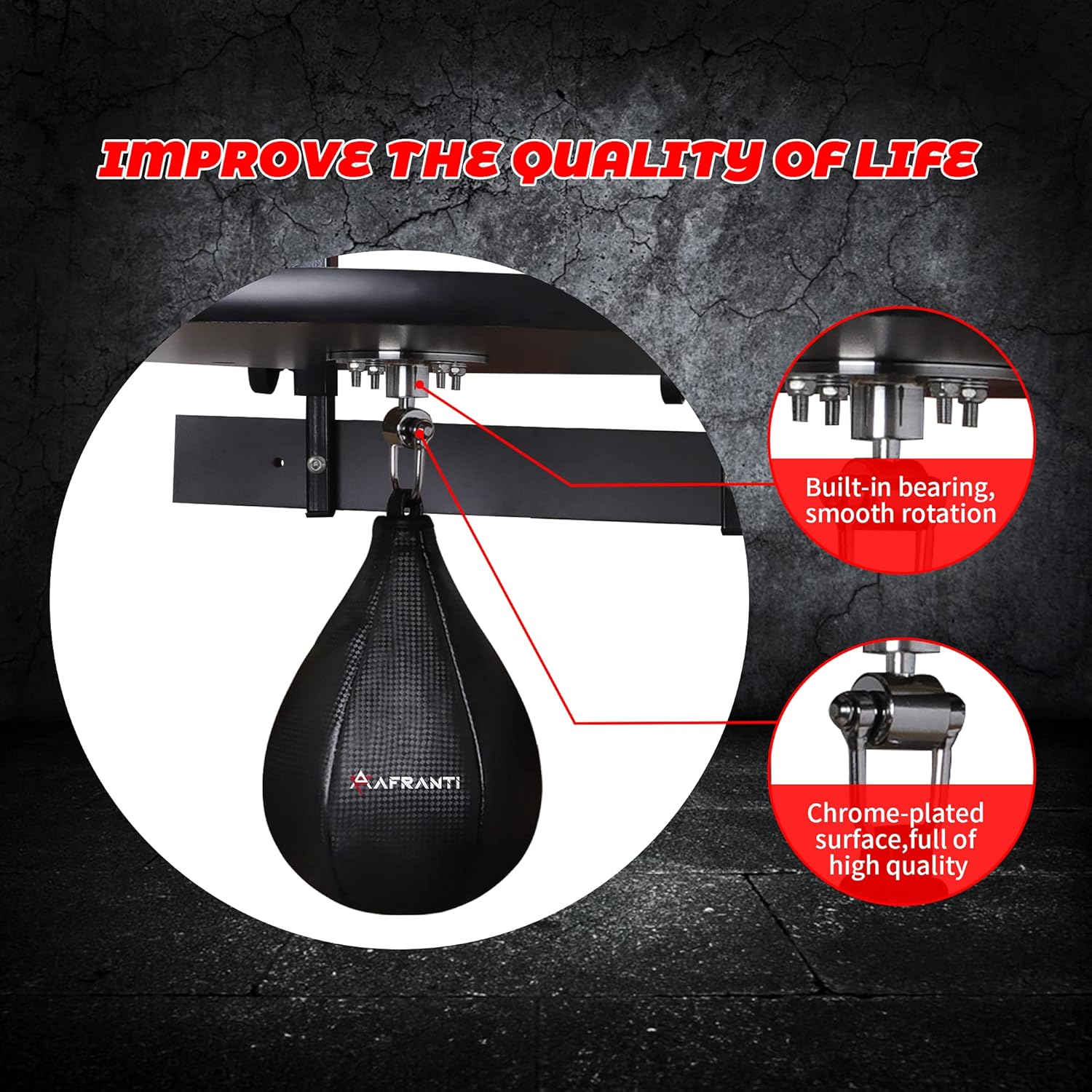 - UPGRADED SPEED BALL: Double-layer faux leather speed ball adopts pear-shaped design, which can be directly through the air and includes a light-weight milk capsule to ensure rapid and balanced rebound. Professional grade ball bearing swivel provide 360-degree flexible rotating for the ball and help it bounce back faster, allows you boxing effectively in high speed