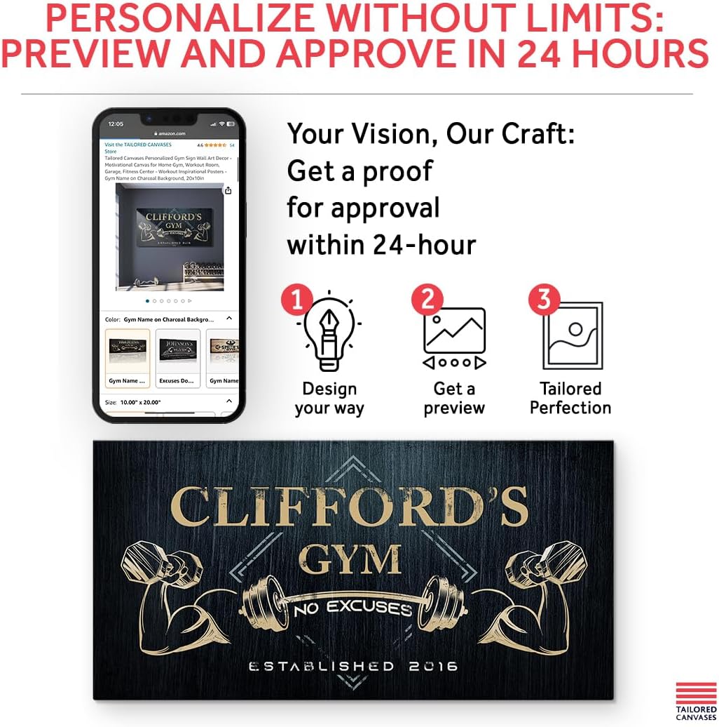 - You get a Preview with a Lifetime Warranty - Check your Personalized Gym Sign Wall Art Decor sent by our Quality Control Team within a day via Amazon Messaging; Love it or We'll make it right for you, no questions asked! Click "Customized Now" & Lets turn your Ideas into Reality!