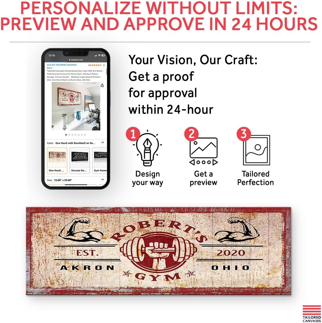 - You get a Preview with a Lifetime Warranty - Check your Personalized Gym Sign Wall Art Decor sent by our Quality Control Team within a day via Amazon Messaging; Love it or We'll make it right for you, no questions asked! Click "Customized Now" & Lets turn your Ideas into Reality!