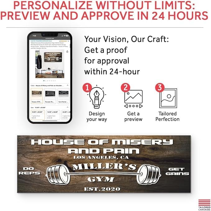 - You get a Preview with a Lifetime Warranty - Check your Personalized Gym Sign Wall Art Decor sent by our Quality Control Team within a day via Amazon Messaging; Love it or We'll make it right for you, no questions asked! Click "Customized Now" & Lets turn your Ideas into Reality!