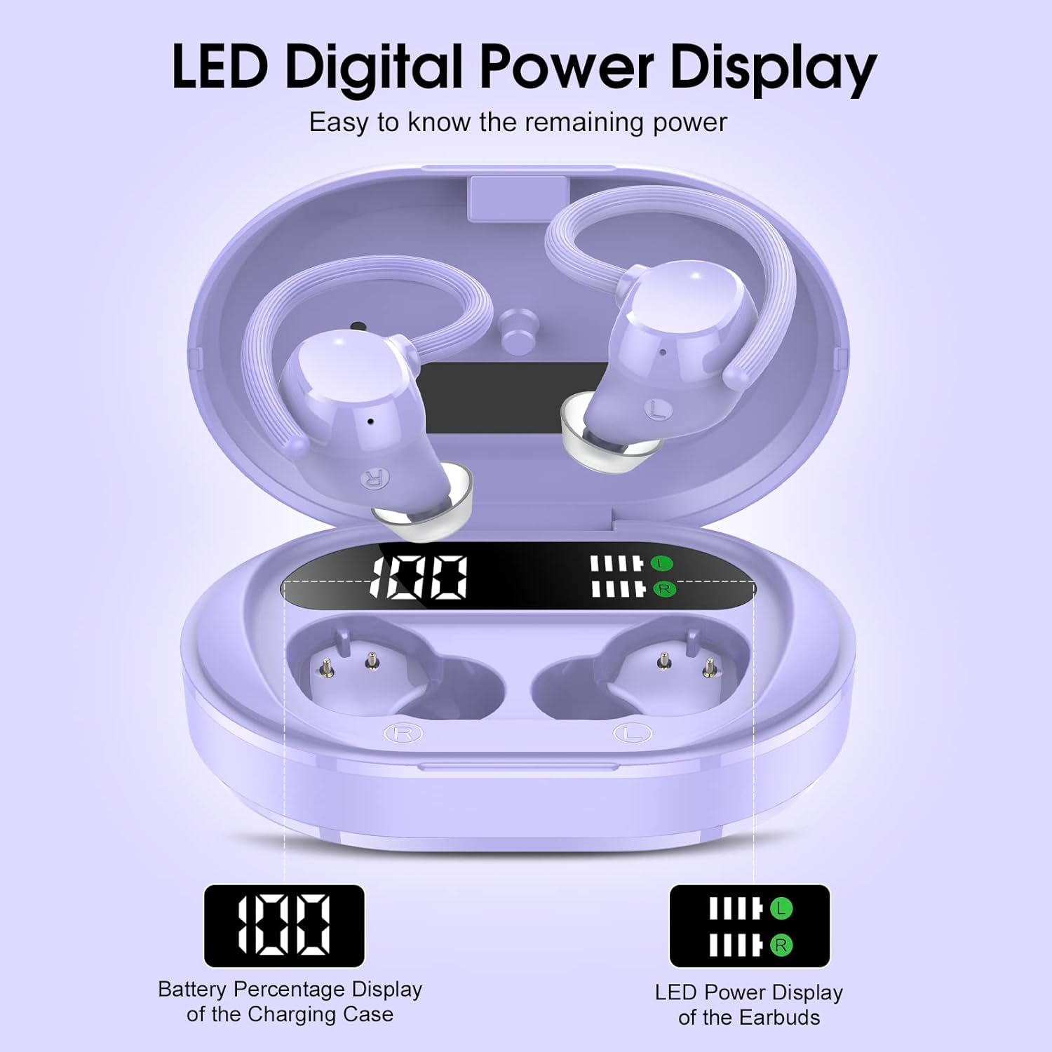 Wireless Earbuds, 2023 New Ultralight Sport Bluetooth 5.3 Headphones In Ear with LED Display, Built-in Mic Earphones, IPX7 Waterproof Wireless Headphones with Earhooks for Gym Workout (Purple)