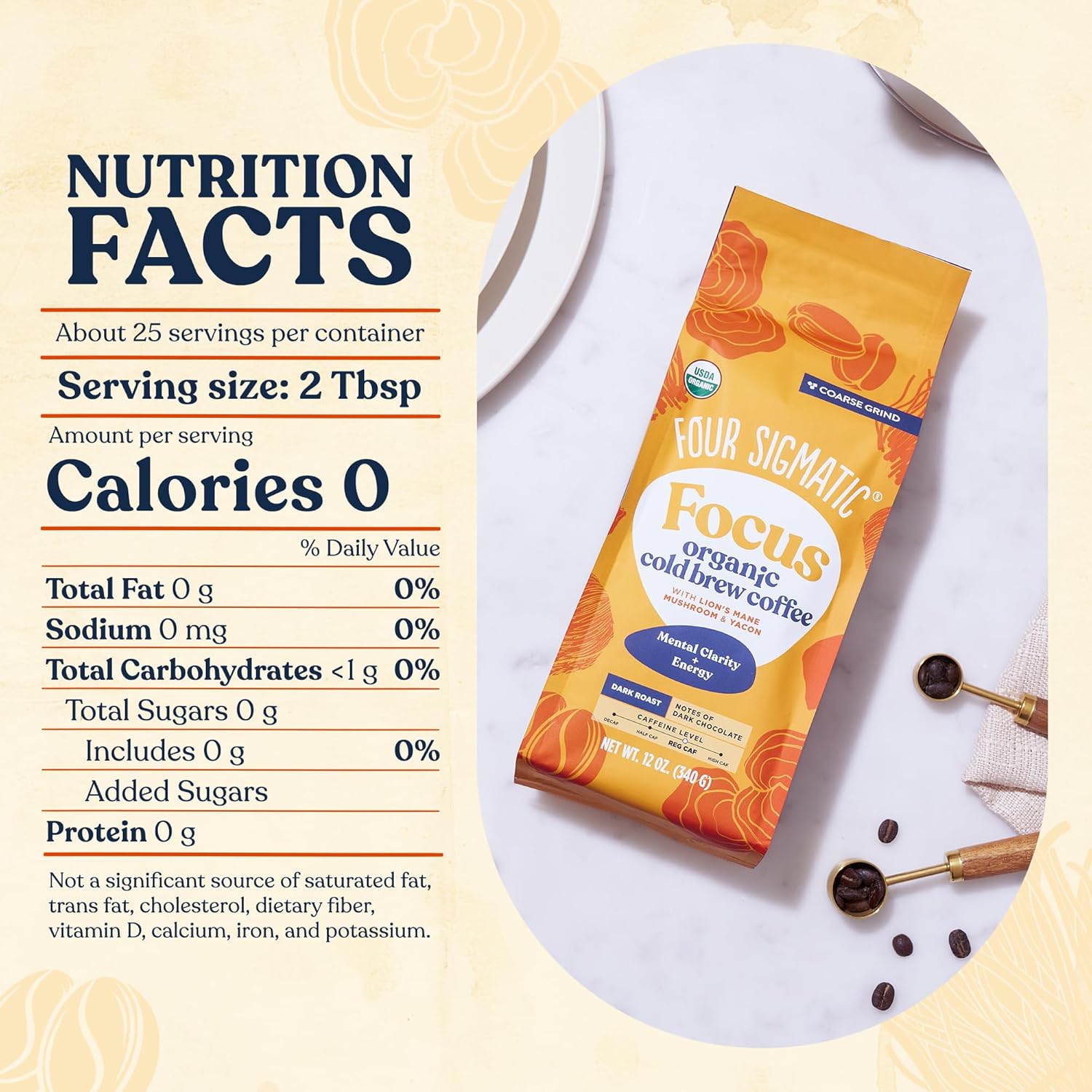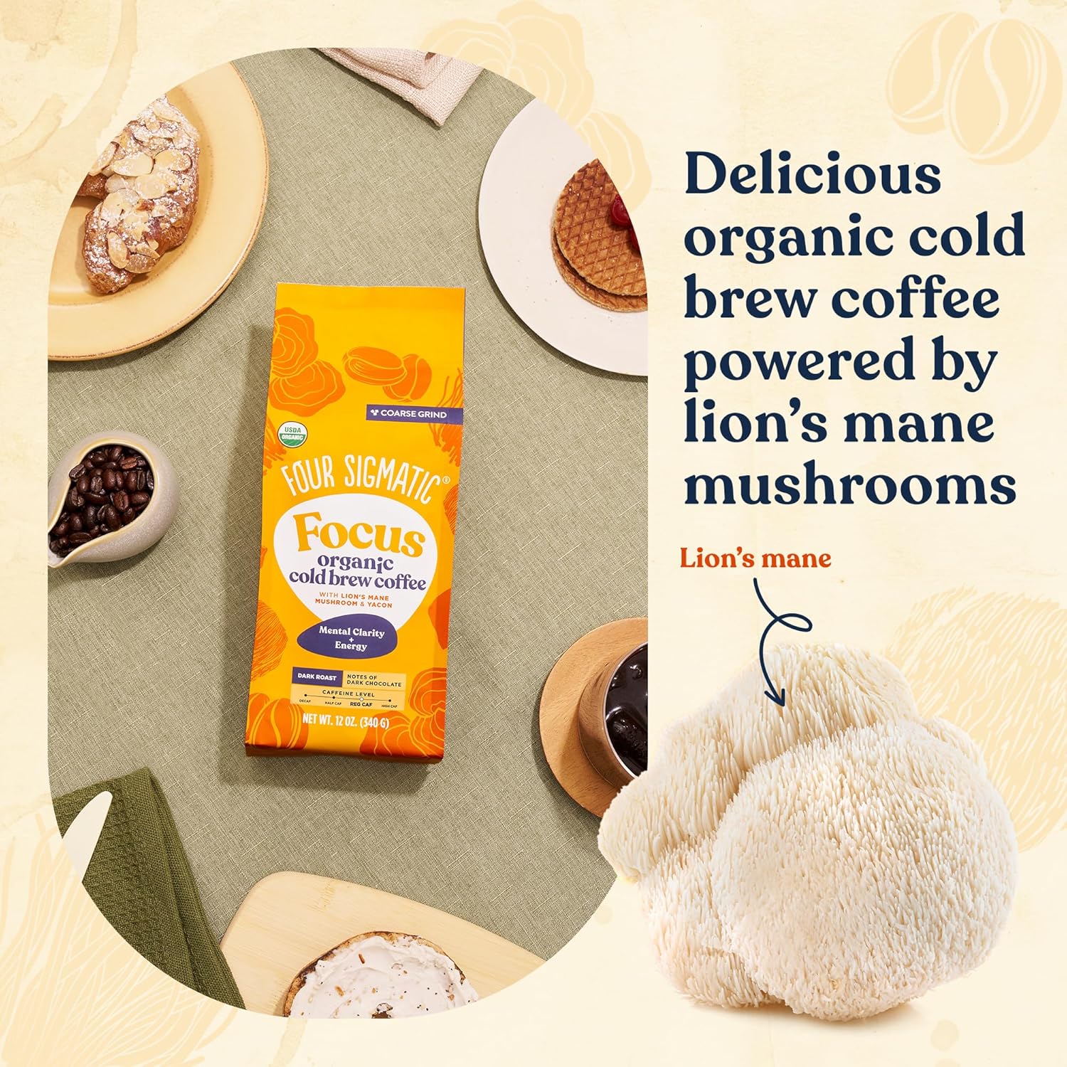 - THE BENEFITS OF COMBINING LION'S MANE MUSHROOM WITH COLD BREW COFFEE β Experience a refreshing twist on your coffee routine with our coffee grounds for iced coffee enriched with 250mg of organic Lion's Mane per serving. Lion's Mane, a functional nootropic mushroom, has been used for centuries worldwide to enhance focus and creativity. When combined with our delicious organic dark roast coffee, it provides a smooth and crash-free source of energy and concentration for hours, without any jitters.