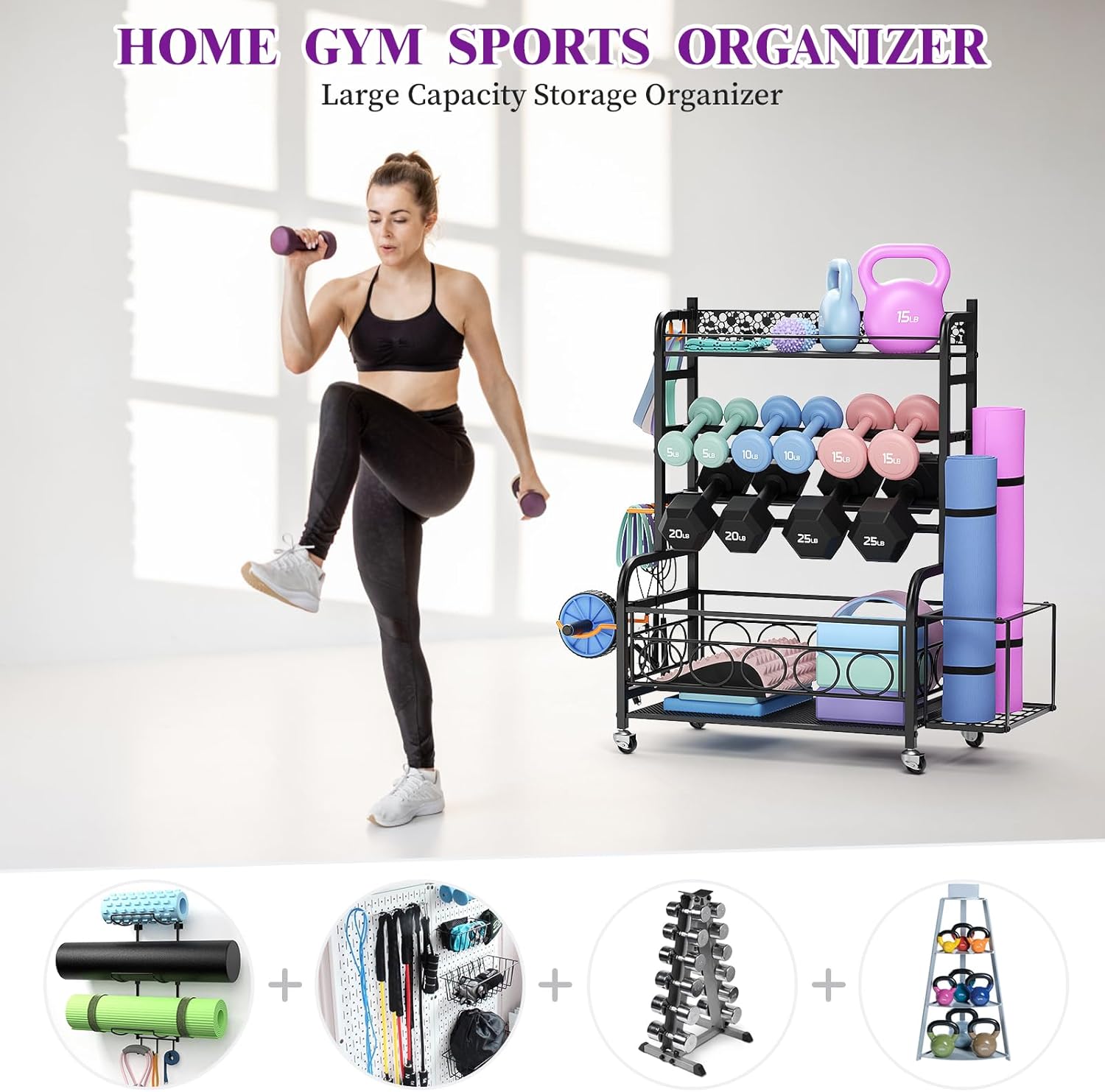 - Large Home Gym Storage Rack: This multi-functional weight rack is equipped with top metal layer for kettlebells, 2-layer dumbbell rack, bottom metal storage basket, a side basket for yoga mat and foam rollers, Several side hooks for fitness bands and rollers. Perfect for organizing your various gym equipment into one storage rack, easy to organize your space and stay organized