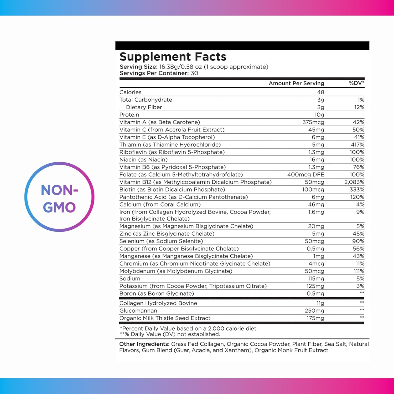 - Special Ingredients : Vitamin A (as Beta Carotene), Vitamin C (from Acerola Fruit Extract), Vitamin E (as D-Alpha Tocopherol), Thiamin (as Thiamine Hydrochloride), Riboflavin (as Riboflavin 5-Phosphate), Niacin (as Niacin), Vitamin B6 (as Pyridoxal 5-Phosphate), Folate (as Calcium 5-Methyltetrahydrofolate), Vitamin B12 (as Methylcobalamin Dicalcium Phosphate), Biotin (as Biotin Dicalcium Phosphate), Pantothenic Acid (as D-Calcium Pantothenate), Calcium (from Coral Calcium), Iron (from Collagen Hydrolyzed Bovine, Cocoa Powder, Iron Bisglycinate Chelate), Magnesium (as Magnesium Bisglycinate Chelate), Zinc (as Zinc Bisglycinate Chelate), Selenium (as Selenium Chelate), Copper (from Copper Bisglycinate Chelate), Manganese (as Manganese Bisglycinate Chelate), Chromium (as Chromium Nicotinate Glycinate Chelate), Molybdenum (as Molybdenum Glycinate), Chloride, Sodium, Potassium (from Cocoa Powder, Tripotassium Citrate), Boron (as Boron Glycinate), Collagen Hydrolyzed Bovine, Glucomannan, Organic Milk Thistle Seed Extract, Grass Fed Collagen, Organic Cocoa Powder, Sea Salt, Natural Flavors, Gum Acacia, Organic Monk Fruit Extract Vitamin A (as Beta Carotene), Vitamin C (from Acerola Fruit Extract), Vitamin E (as D-Alpha Tocopherol), Thiamin (as Thiamine Hydroch… See more