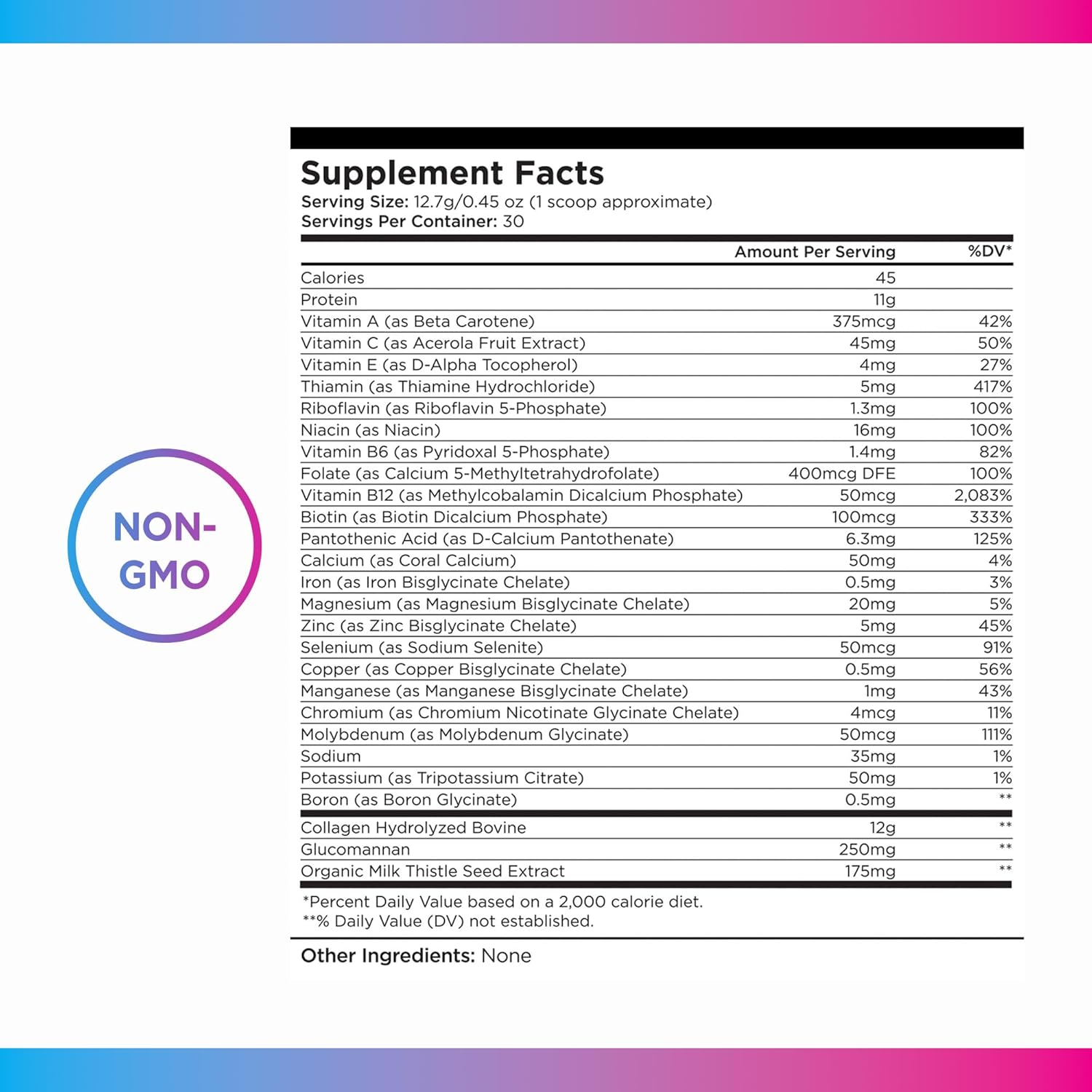 - Special Ingredients : Vitamin A (as Beta Carotene), Vitamin C (as Acerola Fruit Extract), Vitamin E (as D-Alpha Tocopherol), Thiamin (as Thiamine Hydrochloride), Riboflavin (as Riboflavin 5-Phosphate), Niacin (as Niacin), Vitamin B6 (as Pyridoxal 5-Phosphate), Folate (as Calcium 5-Methyltetrahydrofolate), Vitamin B12 (as Methylcobalamin Dicalcium Phosphate), Biotin (as Biotin Dicalcium Phosphate), Pantothenic Acid (as D-Calcium Pantothenate), Calcium (as Coral Calcium), Iron (as Iron Bisglycinate Chelate), Magnesium (as Magnesium Bisglycinate Chelate), Zinc (as Zinc Bisglycinate Chelate), Selenium (as Selenium Chelate), Copper (as Copper Bisglycinate Chelate), Manganese (as Manganese Bisglycinate Chelate), Chromium (as Chromium Nicotinate Glycinate Chelate), Molybdenum (as Molybdenum Glycinate), Sodium, Potassium (as Tripotassium Citrate), Boron (as Boron Glycinate), Collagen Hydrolyzed Bovine, Glucomannan, Organic Milk Thistle Seed Extract Vitamin A (as Beta Carotene), Vitamin C (as Acerola Fruit Extract), Vitamin E (as D-Alpha Tocopherol), Thiamin (as Thiamine Hydroch… See more