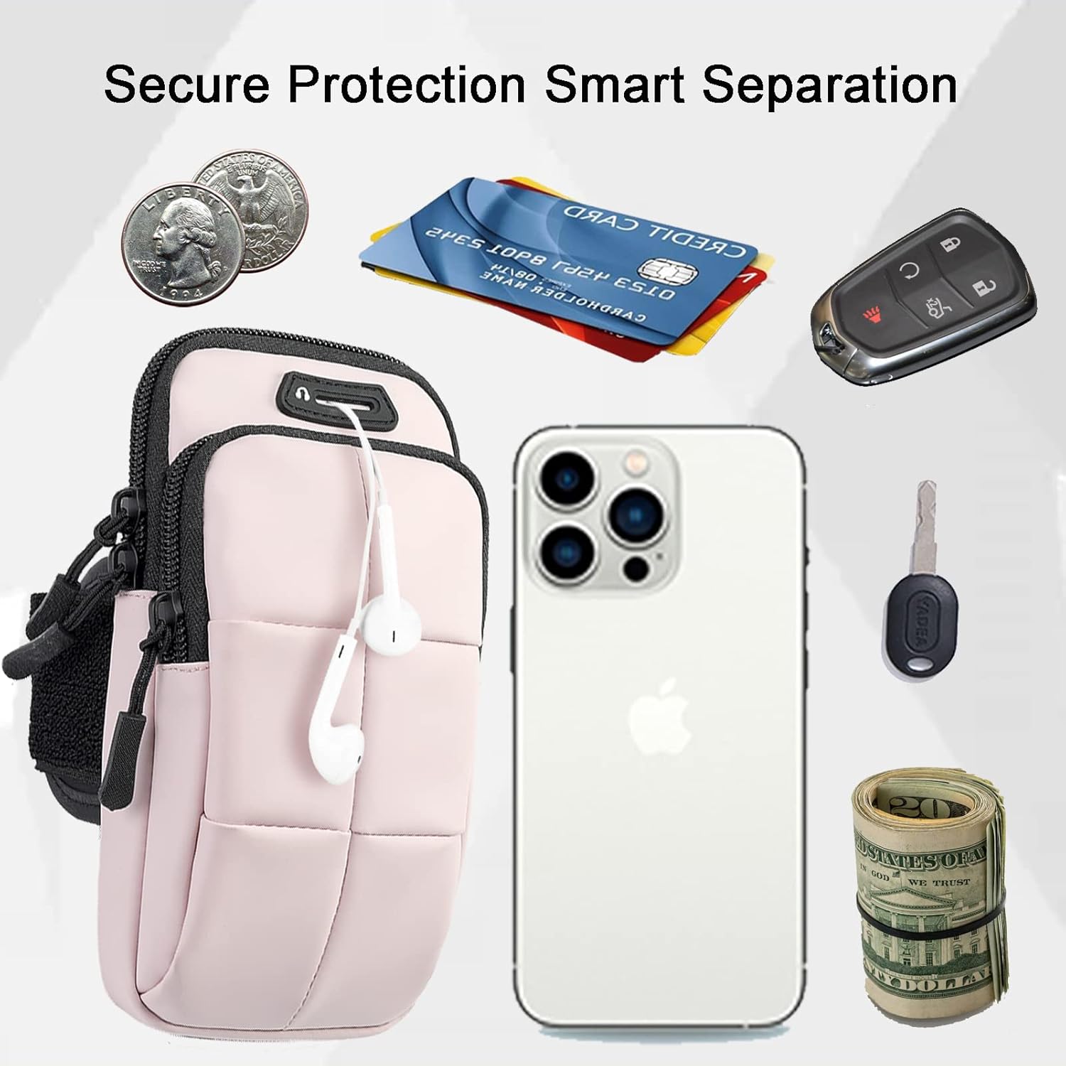 - [Secure Protection]This running armband with double deck and double zipper exercise pouch provides large and safe space for your cellphone as well as your house or car keys, ID/credit cards, cash, earphone, iPod & other accessories whilst doing outdoor activities. Never worry about losing them. Also, headphone and charger cutouts allow convenient access to the phone for hands free and listening music.