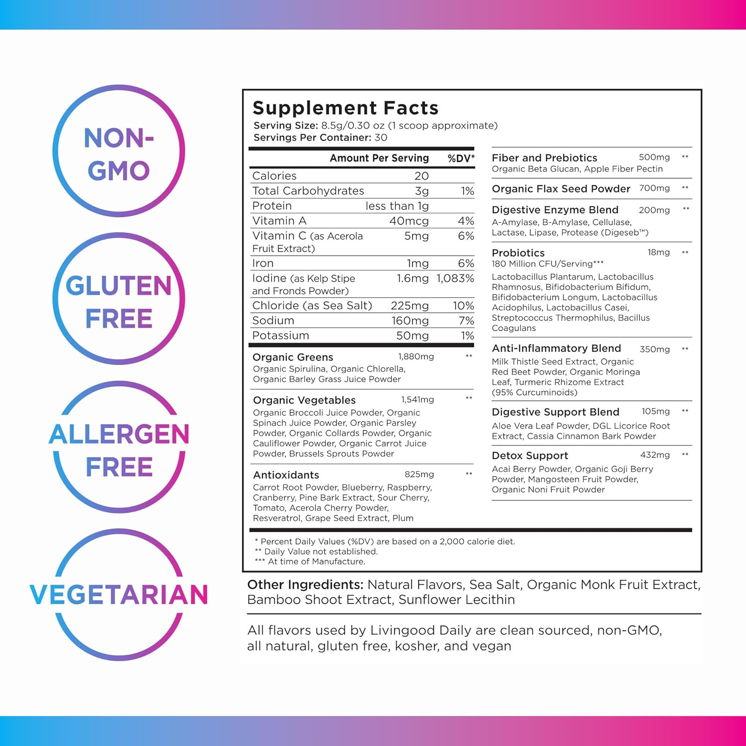 Livingood Daily Greens & Superfood Powder, Super Greens for Gut Health, Green Juice Powder with Spirulina, Chlorella, and Digestive Enzymes, Probiotics for Digestive Support, Original Flavor, 30 Srvgs