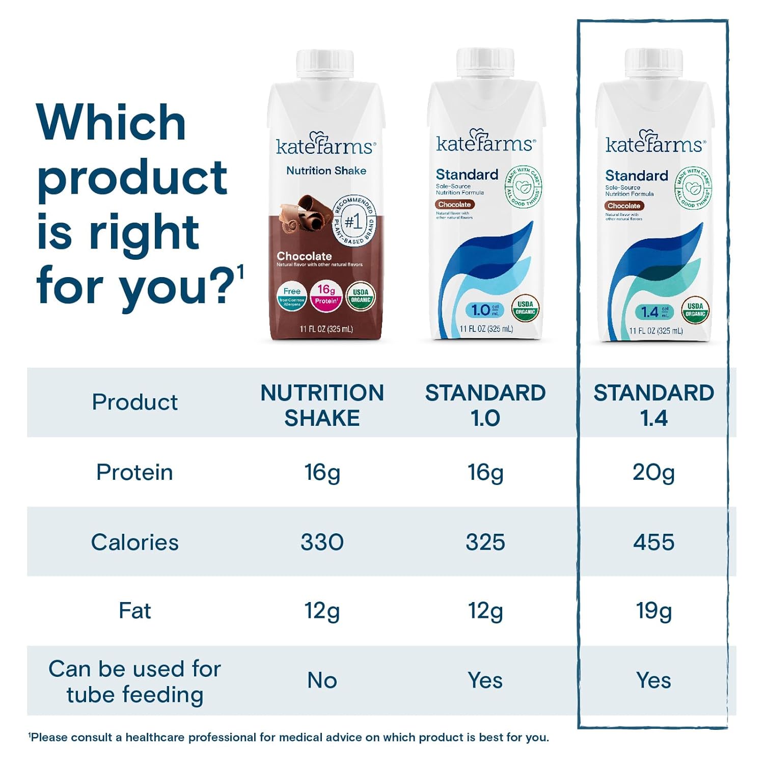 KATE FARMS Organic 1.4 High Calorie Nutrition Shake, Chocolate, 20g Protein, 27 Vitamins and Minerals, Meal Replacement, 11 oz (12 Pack)