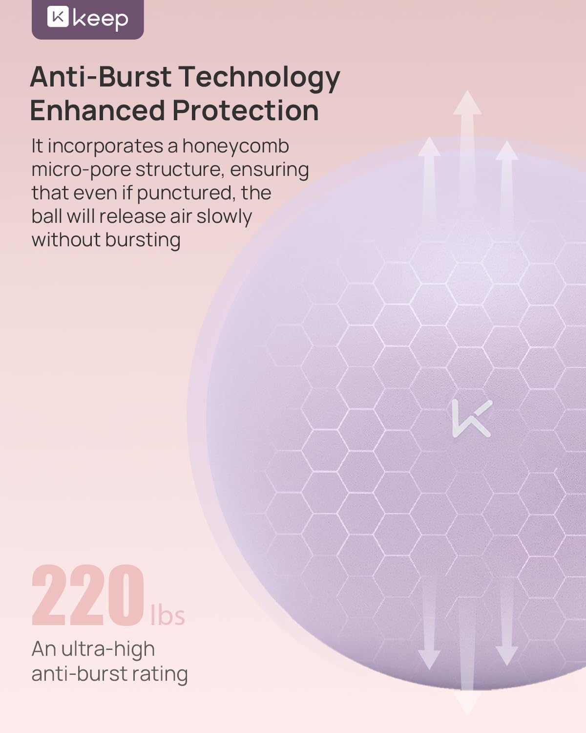- Anti-Bust & Worry-Free -- The KEEP Fitness Ball features anti-burst technology with a honeycomb microporous foaming structure. It has passed strict explosion-proof test, with an ultra-high anti-burst rating of 1300 lbs. In the event of puncture by sharp objects, the ball deflates slowly rather than bursting, ensuring your safety is always protected