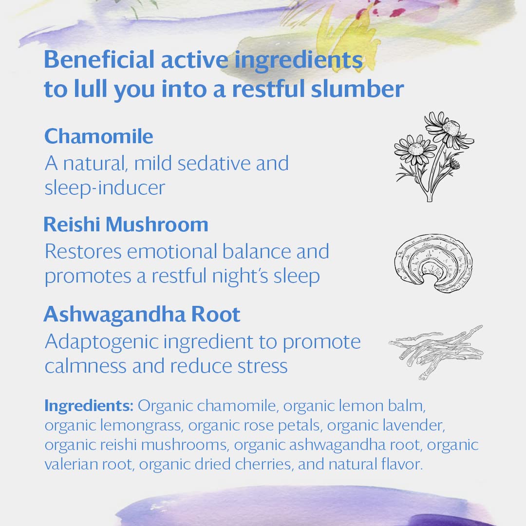- ADAPTOGENIC MUSHROOMS AND HERBS. We've crafted a blend with adaptogenic ingredients like reishi mushrooms, valerian root, and ashwagandha root that not only help you relax but also provide whole body wellness.
