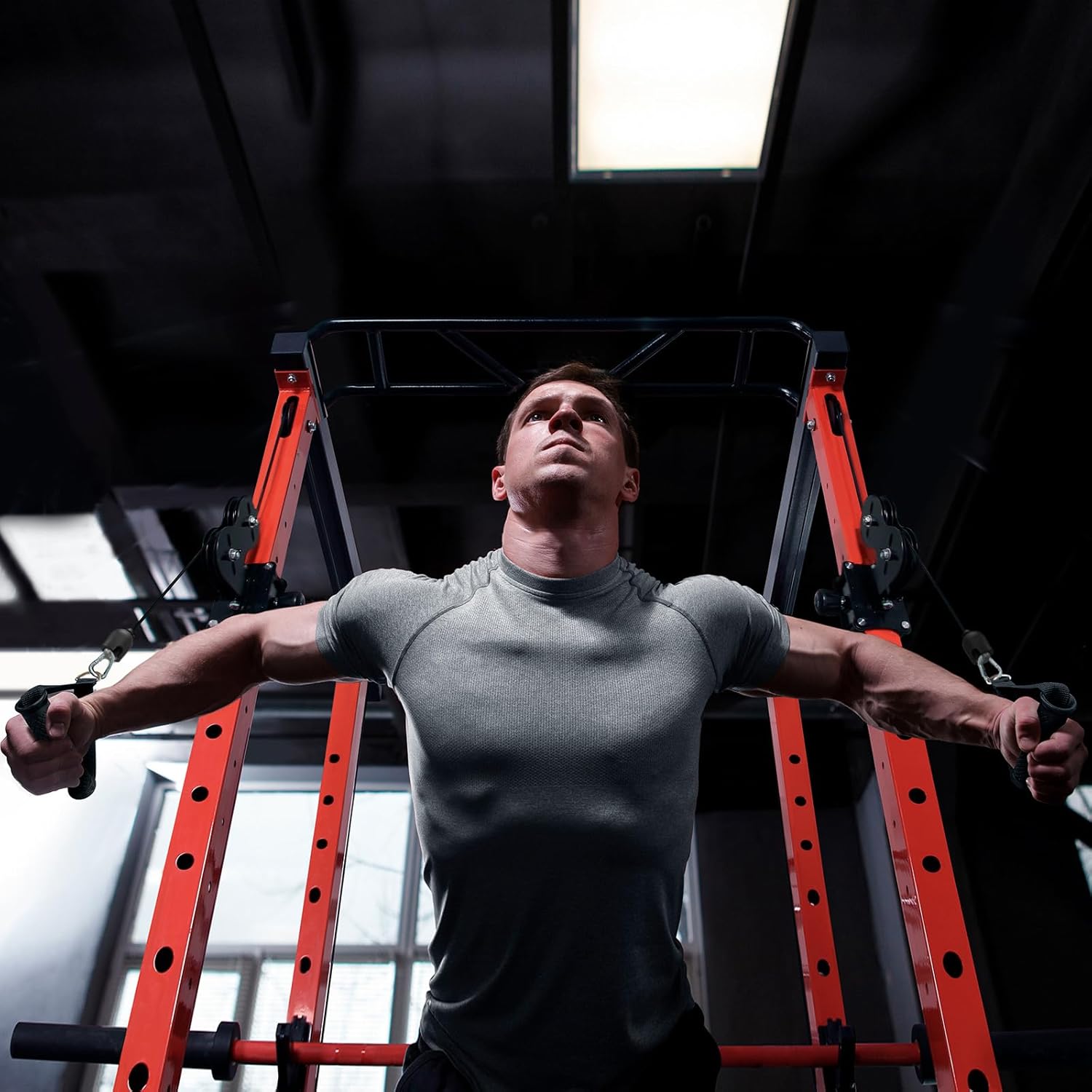 - Free Utility Machine Attachments - The workout cage comes with a complete set of 20+ attachments, including 2 x J hooks, 2 x Safety Spotter Arms, 2 x Cable Grip Handles, 1 x Lat Pulldown Bar, 1 x Row Bar, 1 x Row Low Foot Tube, 1 x 360ยฐ Landmine, 4 x Plate Storage Pins, 2 x Weight Holers for the Cable System, 4 x band pegs, as well as 1 x Multi-grip Pull Up Bar. These attachments meet all your needs for various workouts