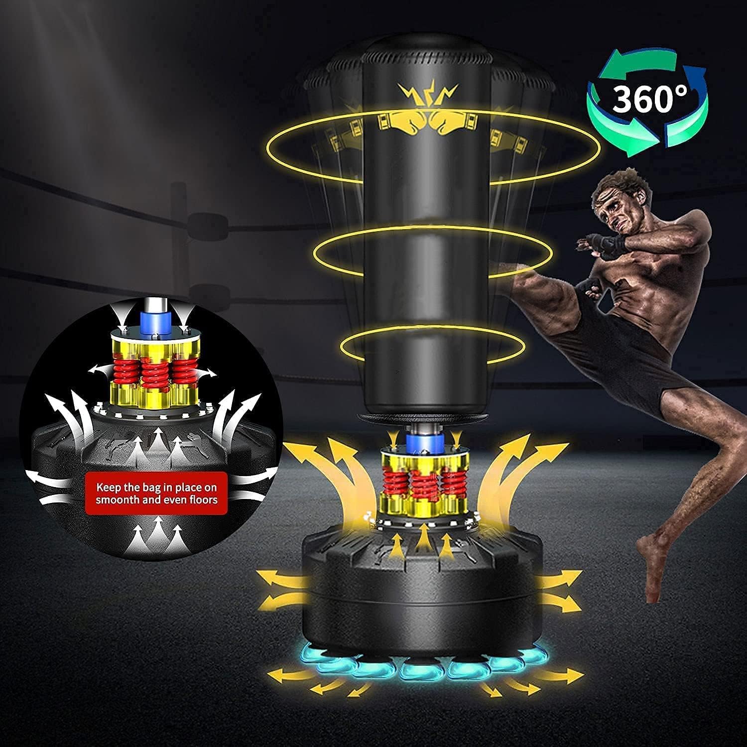 - 【Stable Punching Bag with Stand】-7.5MM thicken ABS base bears 140kg weight easily, supported by 12 strong suction cups help keep the kickboxing bag with stand in position on smooth and even floors, the base weighs up to 205lbs when filled with sand for max stability (Base will be more stable if filled with sand than water) ;4 springs deliver 15-45° fast-rebound, 2 absorbers achieve 360° shock and noise absorption during your boxing, punching, hitting, kicking.