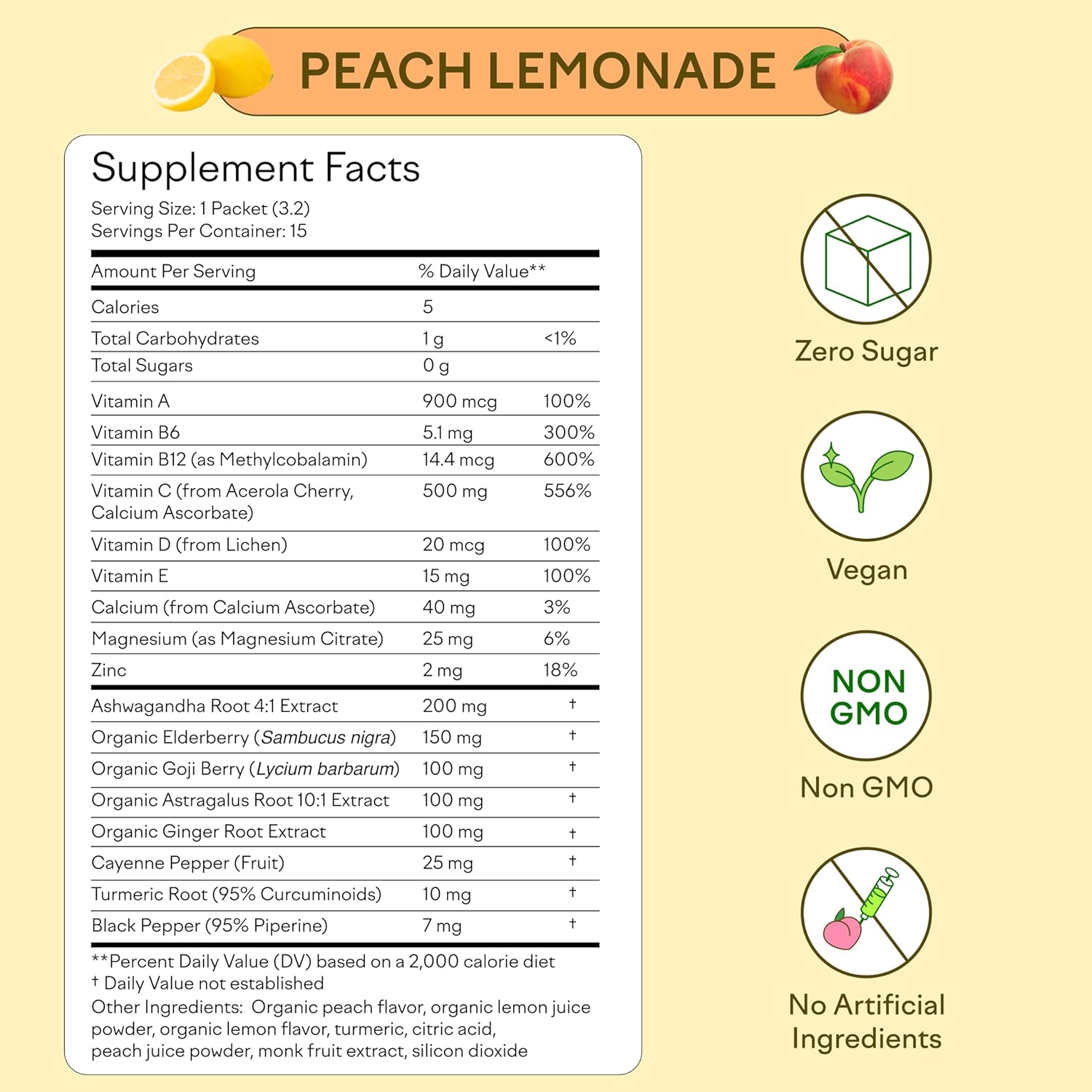 Feel Goods Immunity Icon, Zero Sugar, Vitamin C, A, B, D, E & Zinc, Organic Elderberry, Ashwagandha, Drink Mix Powder, Vegan, Non GMO, Caffeine & Gluten Free | Peach Lemonade, 15 Count