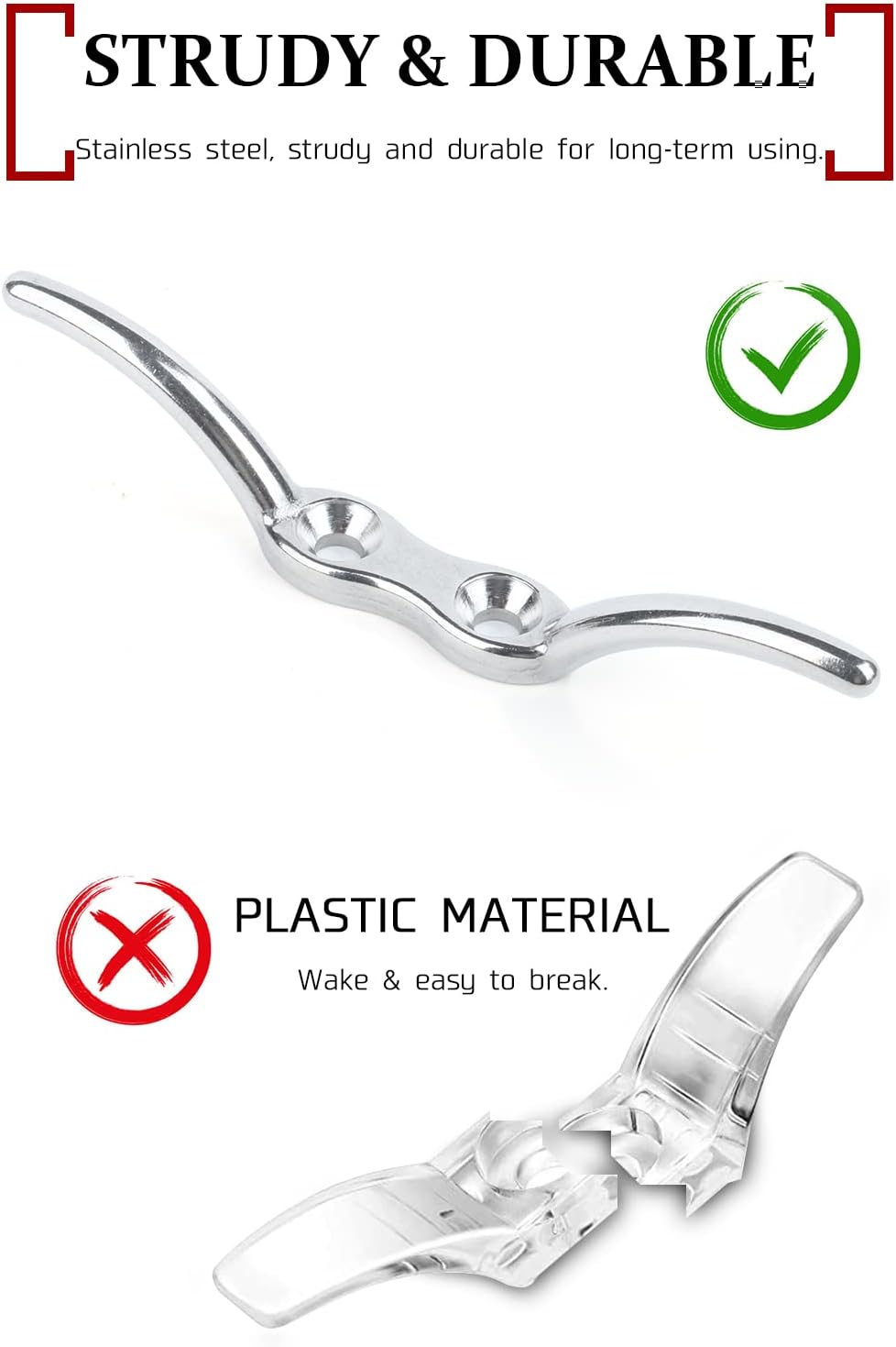 - 316 Stainless Steel Rope Cleat Base: Considering for make better using experience for everyone,we use 316 stainless steel to produce it. SUS316 would do better on your daily using,compared with SUS304,it hss superior corrosion resistance, ,longer life and durability, can be used under hot and humid environment.Therefore,these stainless steel cleat would especially perform well on marine usages.