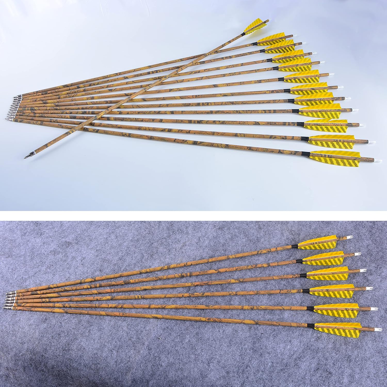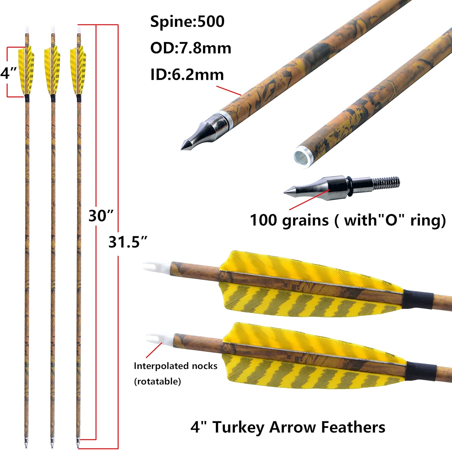 AMEYXGS Camo Carbon Arrow 30 Inch Practice Hunting Arrow Spine 500 with 4 Inch Turkey Feathers for Traditional Recurve Compound Bows