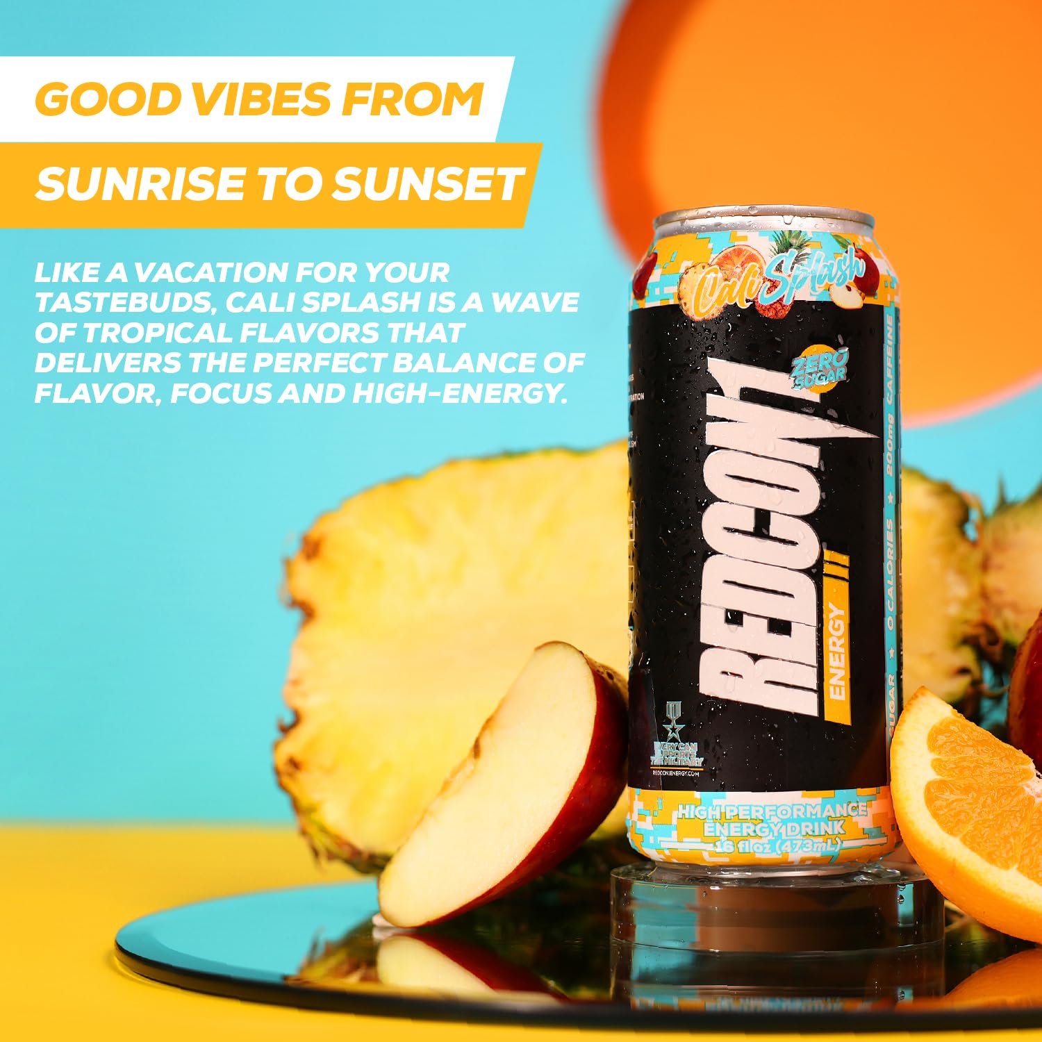 REDCON1 Energy High Performance Drink, Cali Splash - Zero Sugar Energy Drink with Alpha GPC Nootropic - 200mg of Natural Caffeine from Green Coffee Beans - Vitamin B6, B12 & B5 to Boost Mood (12 ct)
