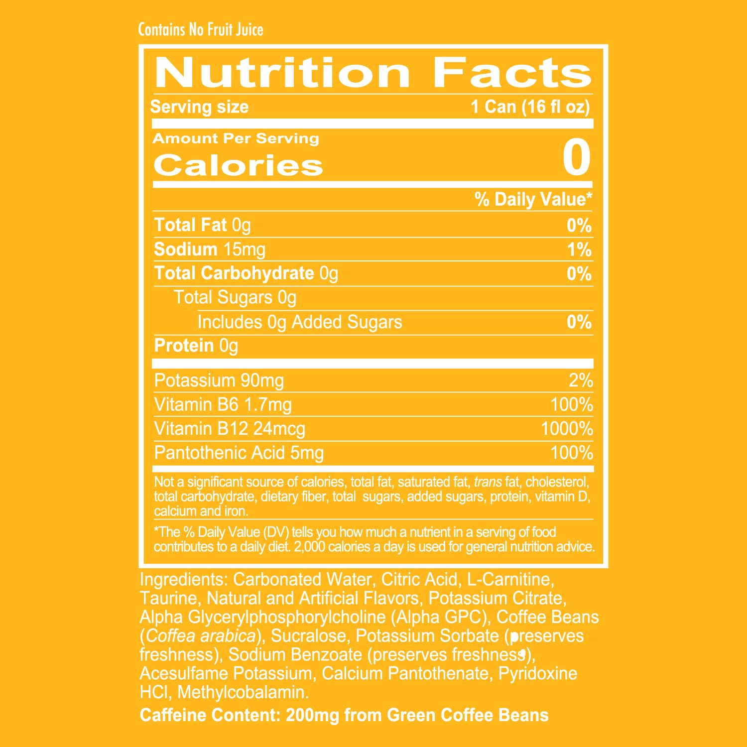 - Premium Ingredients Backed By Science - These zero sugar energy drinks contain 200mg of natural caffeine from green coffee beans, which helps promote wakefulness, as well as 1g of l-carnitine, which may help the preservation of muscle.