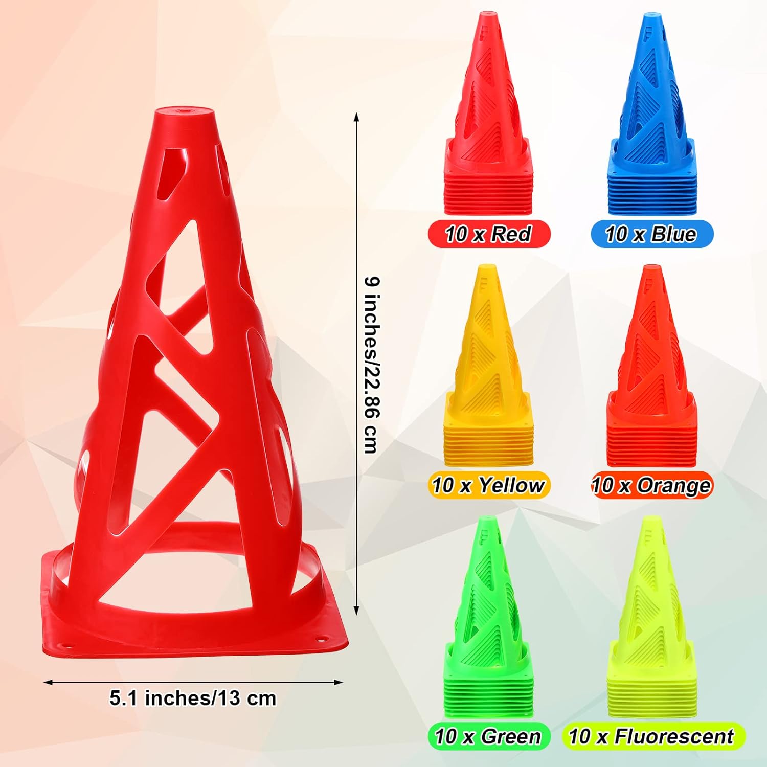 60 Pieces Plastic Agility Cones, 9 Inch Indoor Outdoor Training Sport Cone, Soccer Flexible Cone Sets Marker Cones for Kids Dogs Training, Party, Traffic, Drills, Basketball, Soccer, Assorted Colors