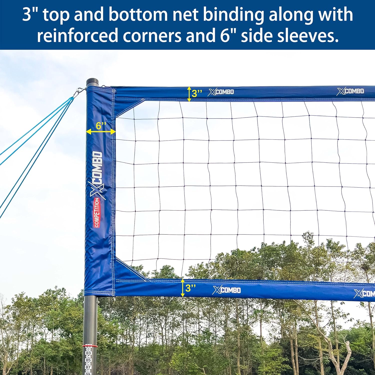 - Engineered for Tournament Play: Achieve even net tension with our pioneering sleeved slip-on net. Experience a professional grade regulation size 32' L x 3' H net from top to bottom, featuring 3’’ top and bottom net binding, reinforced corners, and 6" side sleeves. Built to withstand powerful spikes and serves.