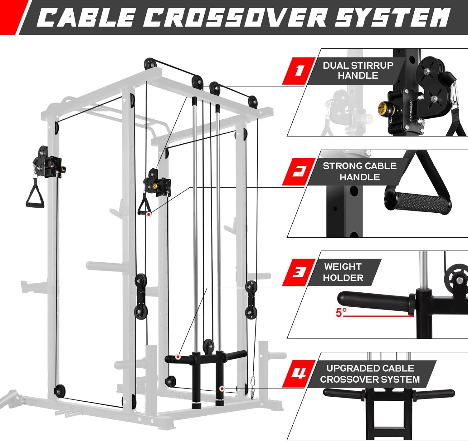 - Free Utility Machine Attachments - The workout cage comes with a complete set of 20+ attachments, including 2 x J hooks, 2 x Safety Spotter Arms, 2 x Cable Grip Handles, 1 x Lat Pulldown Bar, 1 x Row Bar, 1 x Row Low Foot Tube, 1 x 360ยฐ Landmine, 4 x Plate Storage Pins, 2 x Weight Holers for the Cable System, 4 x band pegs,as well as 1 x Multi-grip Pull Up Bar. These attachments meet all your needs for various workouts