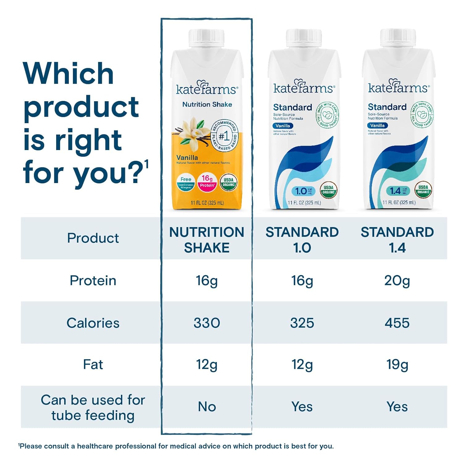 Kate Farms Organic Nutrition Shake, Vanilla, 16g Protein, 27 Vitamins and Minerals, Meal Replacement, 11 oz, 6 Pack