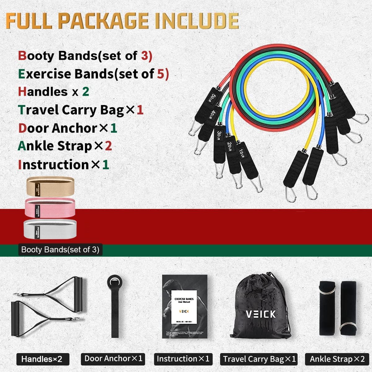 - What Are Included - 5 Tube Resistance Bands, 3 Booty Bands, 2 Soft Cushioned Handles, 2 Ankle Straps, 1 Door Anchor, 1 Exercise Guidance, 1 Carrying Bag
