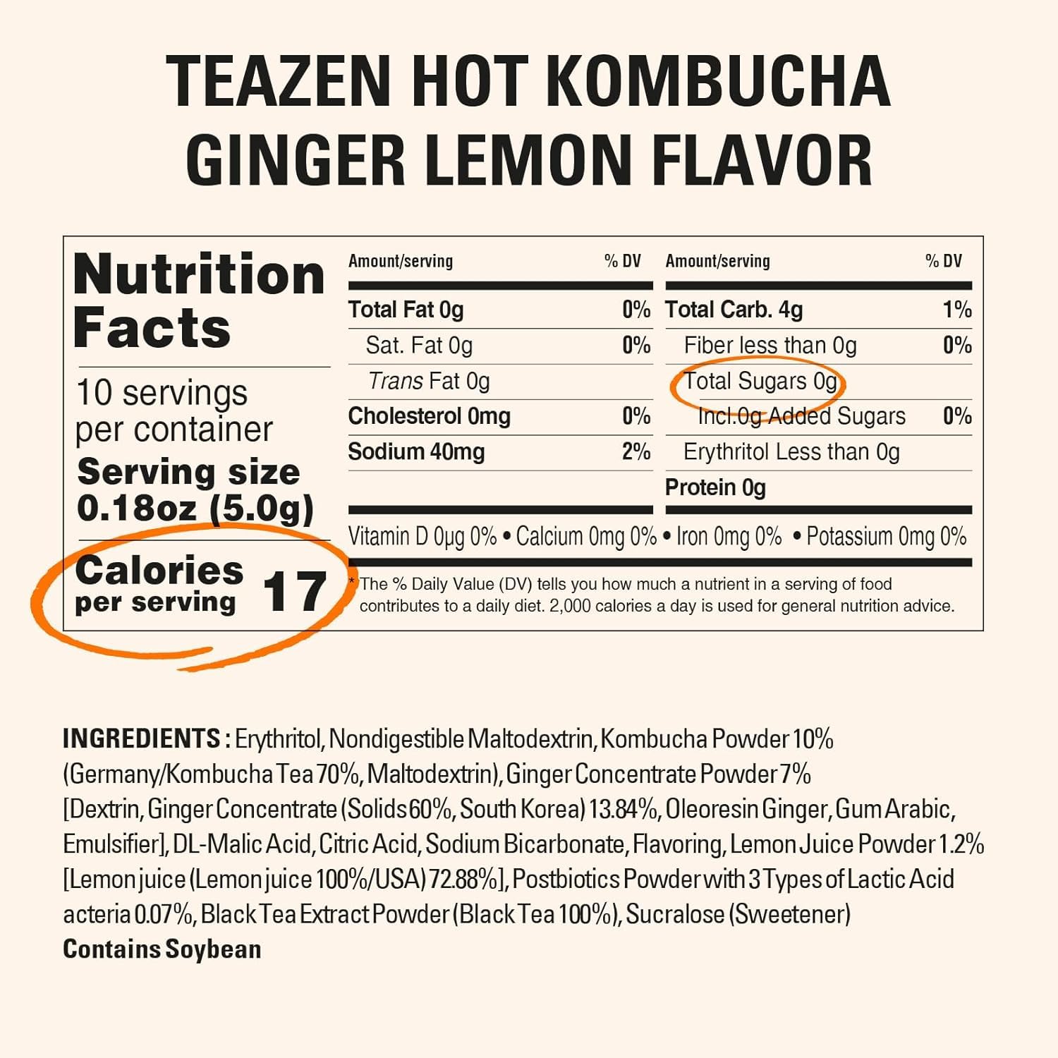 - 🔥TEAZEN Kombucha, with just 15kcal per stick, is a Sugar-Free, Alcohol-Free Probiotic tea. It contains both Prebiotics and Probiotics and has low caffeine content, making it suitable for everyone to enjoy. Gather your family and indulge in TEAZEN Kombucha together.