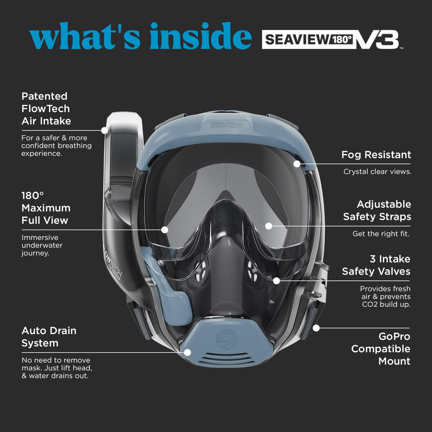 - SAFETY FIRST- DESIGNED AND TESTED IN THE USA - The V3 snorkeling mask was created by our team of experienced product designers and engineers. Through meticulous iteration we improved the airflow, visibility, fit, camera mount and safety of the full face snorkeling mask experience. We used 3rd party experts to measure the airflow and CO2 elements of the mask to ensure a safe user experience for all.