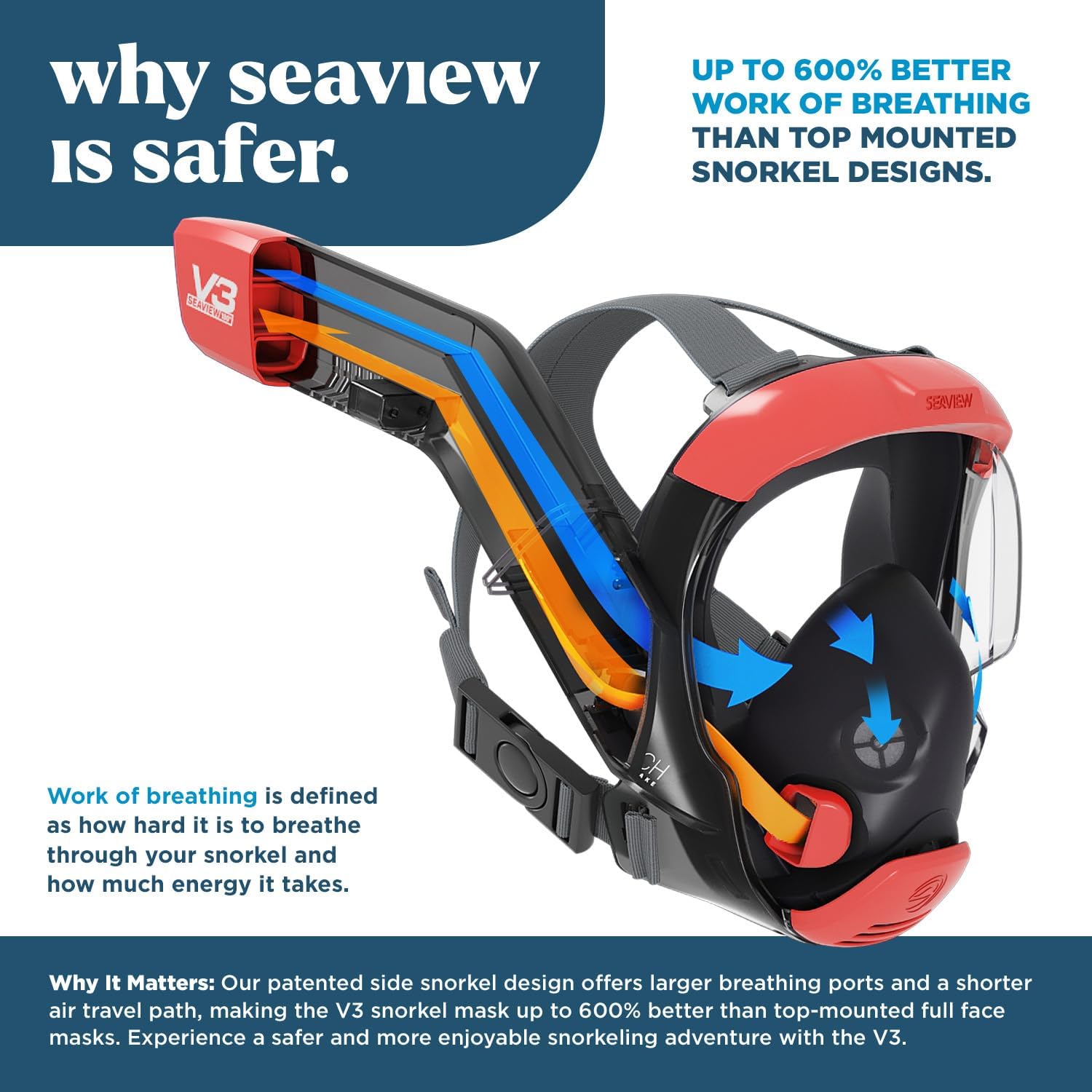 - SAFETY FIRST- DESIGNED AND TESTED IN THE USA - The V3 snorkeling mask was created by our team of experienced product designers and engineers. Through meticulous iteration we improved the airflow, visibility, fit, camera mount and safety of the full face snorkeling mask experience. We used 3rd party experts to measure the airflow and CO2 elements of the mask to ensure a safe user experience for all
