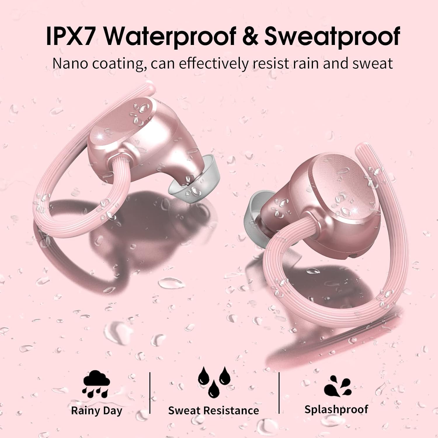 - Sport Design and IP7 Waterproof: Flexible, soft silicone earhooks fit all ear shapes for a perfect fit in your ears, ensuring your earbuds stay comfortable and secure while playing sports and outdoor activities. The wireless headphones are IP7 nanometer waterproof, so you don't have to worry about rain and sweat to enjoy high quality music.