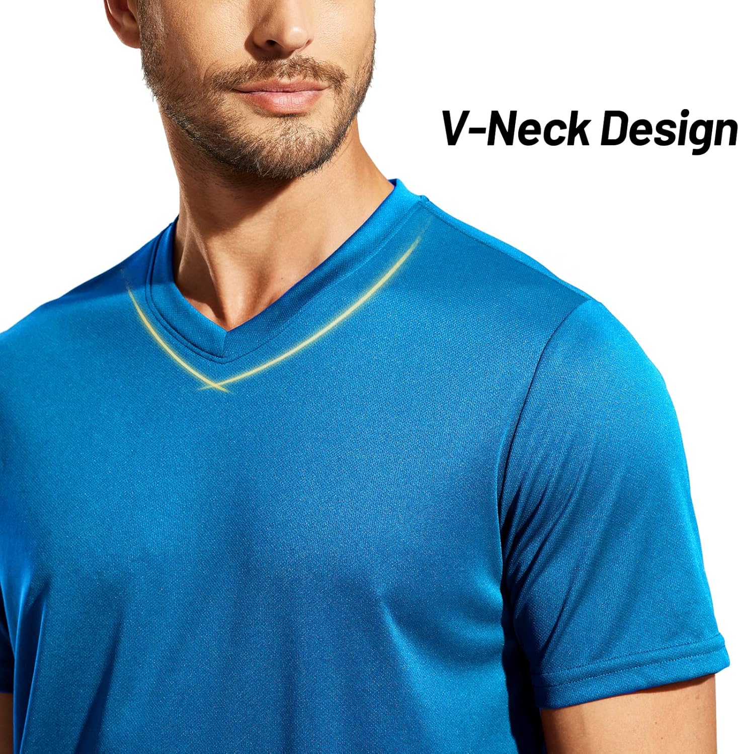 - V-Neck Design: V-Neck provides a nonrestrictive fit; short-sleeve allows for a wider range of motion. 4-way stretch knit that fends off sweat and follows your every move