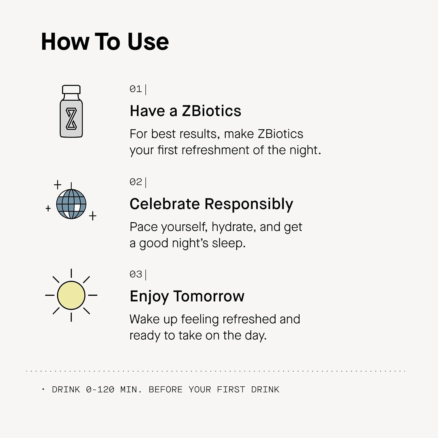 - DRINK BEFORE DRINKING: 1) Drink ZBiotics, 2) Drink Responsibly, 3) Get plenty of rest.