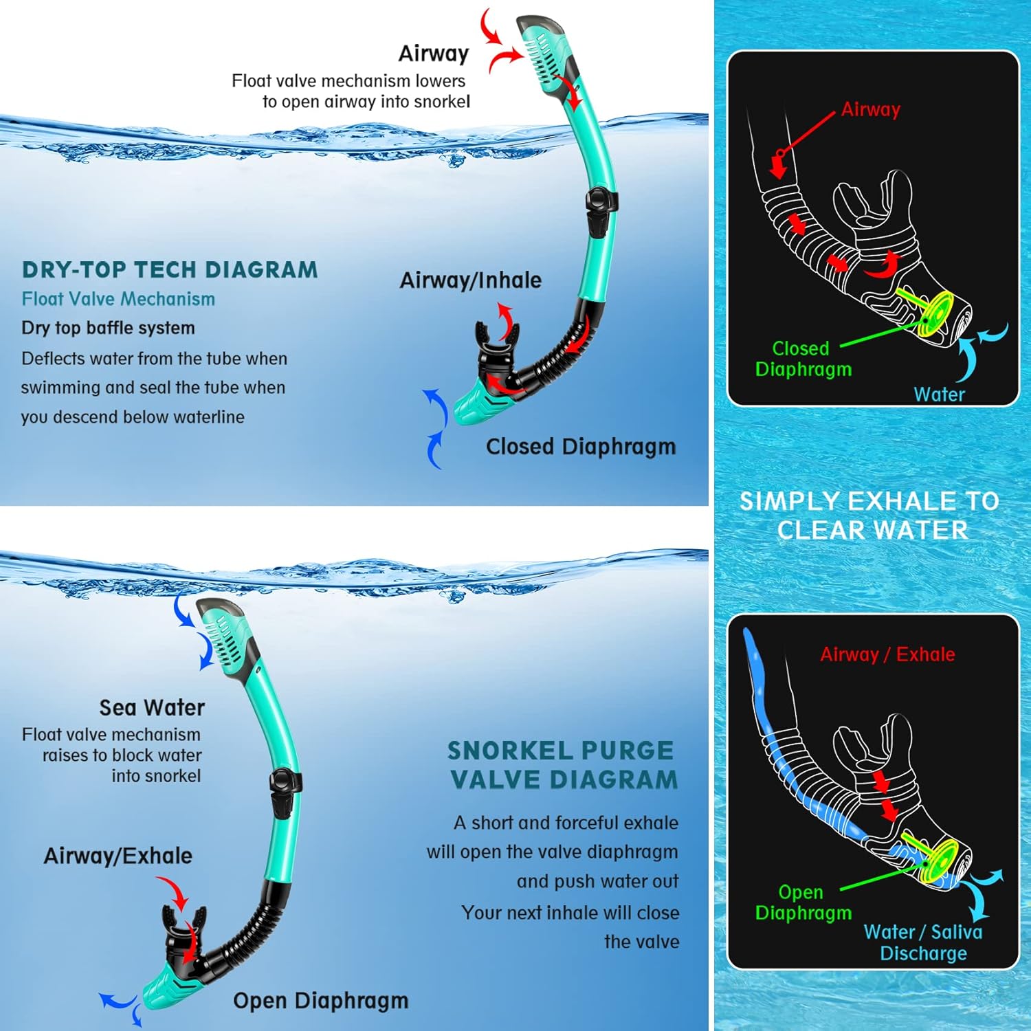 - Unobstructed breathing dry top snorkel: a high-quality snorkel with a dry-top valve that seals the breathing tube when submerged. dry top snorkel is designed to keep water from entering the breathing tube, ergonomic silicone mouthpiece is comfortable and durable. Lower purge valve allows water to be quickly expelled, so you can enjoy easy and unobstructed breathing while diving underwater.