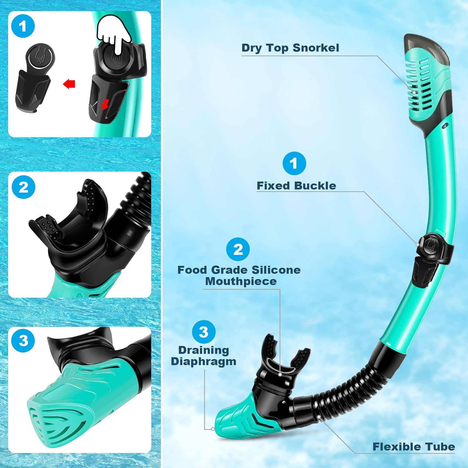 - Unobstructed breathing dry top snorkel: a high-quality snorkel with a dry-top valve that seals the breathing tube when submerged. dry top snorkel is designed to keep water from entering the breathing tube, ergonomic silicone mouthpiece is comfortable and durable. Lower purge valve allows water to be quickly expelled, so you can enjoy easy and unobstructed breathing while diving underwater.