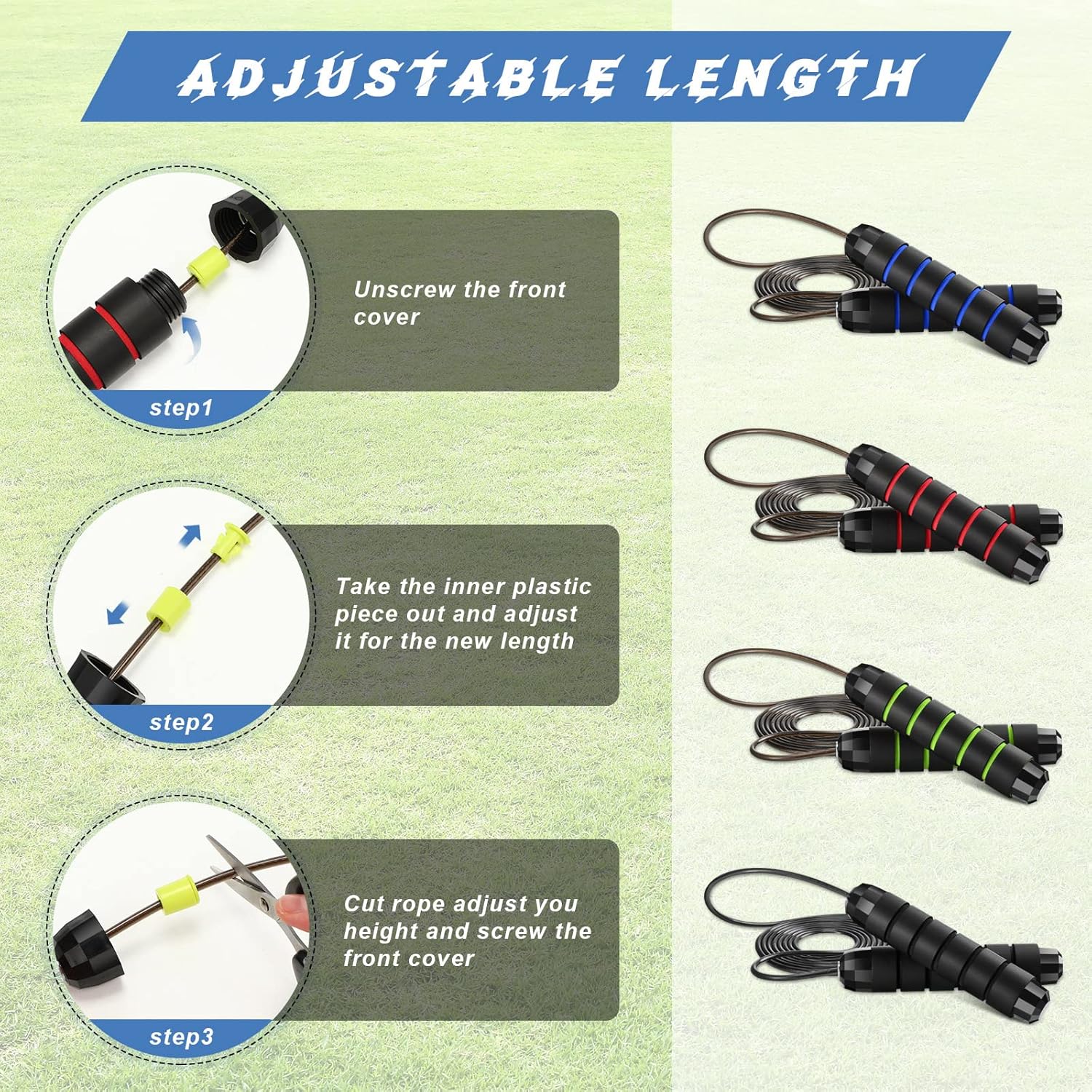 - Adjustable Length: our skipping rope is about 9 feet long and the length is adjustable; The jump rope is equipped with a convenient piston ring, which can be adjusted quickly according to your height and habits, suitable for people of different age groups and levels, such as adults, men, women and more