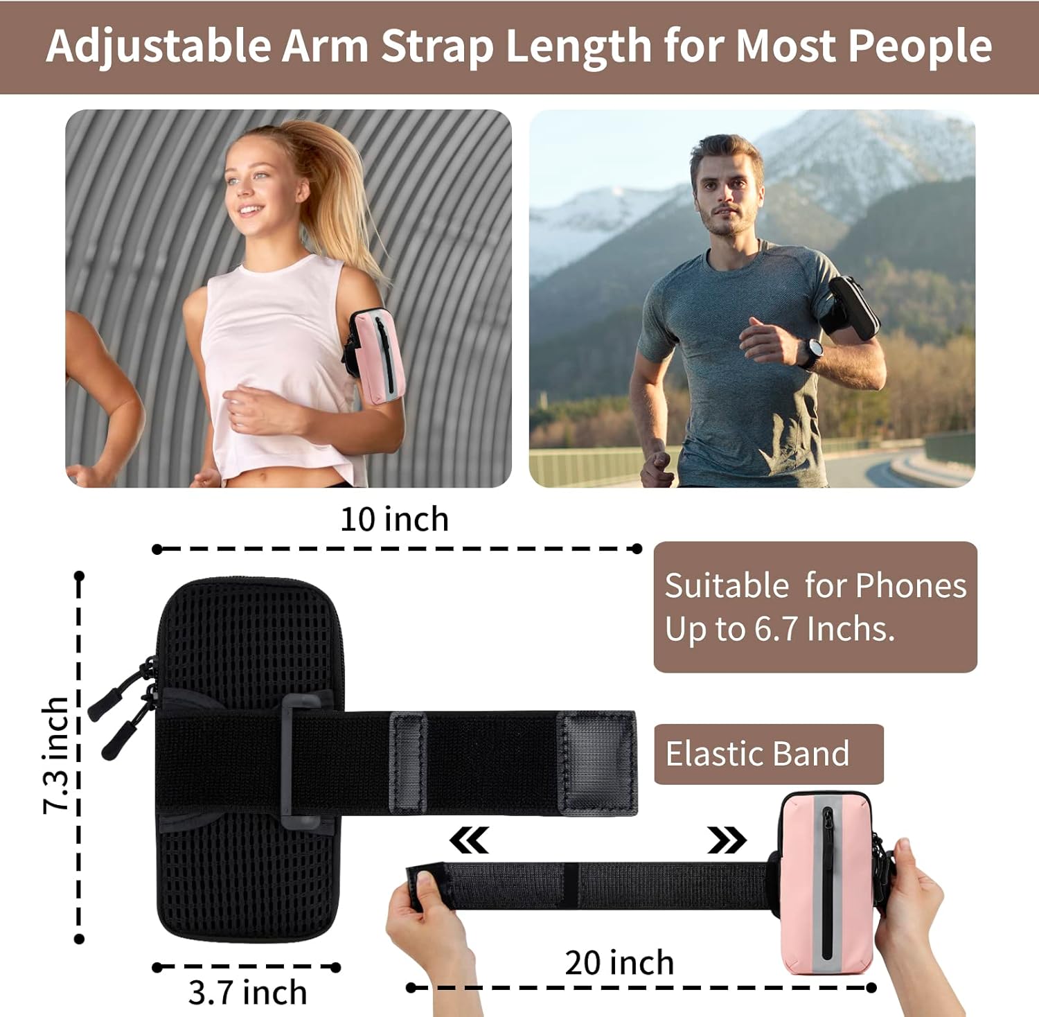 - [Universal Size]: The arm band is 7.3*3.5 inches, which can fit a cell phone up-to 6.7 inches. The phone holder armband is compatible with most cell phone,fits iPhone 14/13/12/11/Pro/Pro Max/Plus/Mini/SE/Xs Max/Xs/XR/X/8/7/6/Samsung Galaxy up to 6.7 inchs, etc.