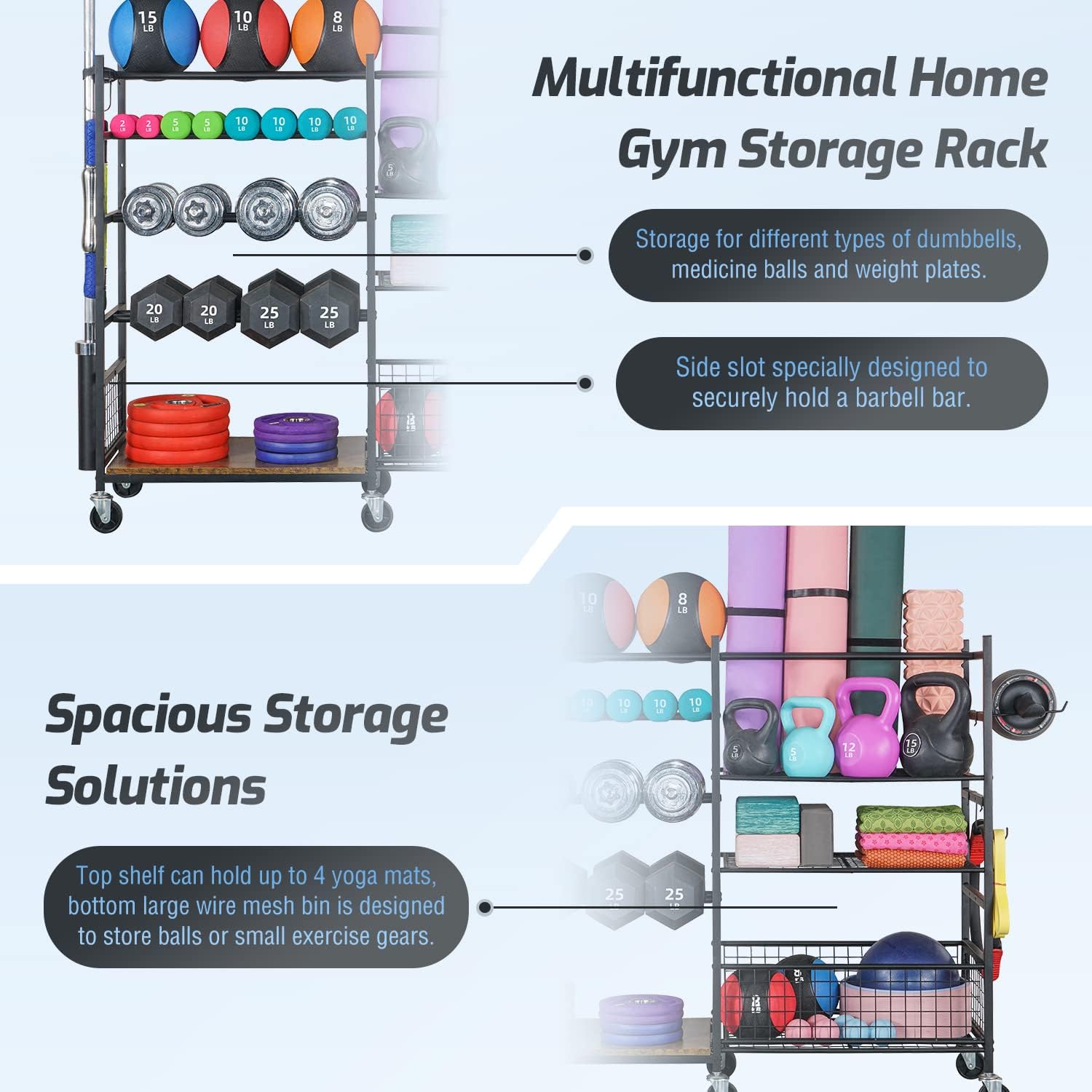 - 【Multifunctional Home Gym Organizer】: Organize your exercise gears and sports equipment with ease using this versatile storage rack designed for dumbbells, kettlebells, barbells, yoga mats, medicine balls, basketballs, footballs, gloves, skateboards, and more.