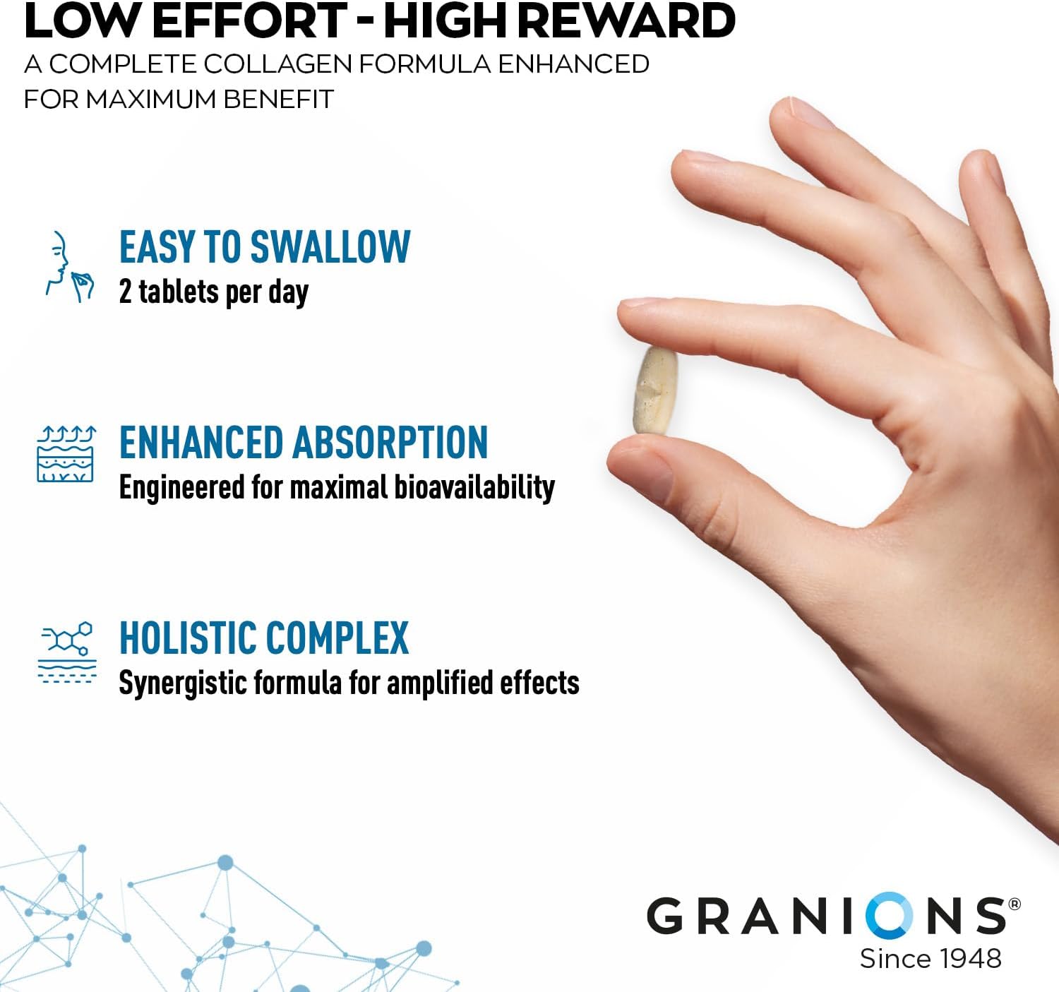 - OPTIMIZED ABSORPTION FISH COLLAGEN. 750mg of low molecular weight Type I Hydrolyzed Marine Collagen tablets for women and men. Promotes skin, hair & nail strength, enhancing elasticity & hydration.