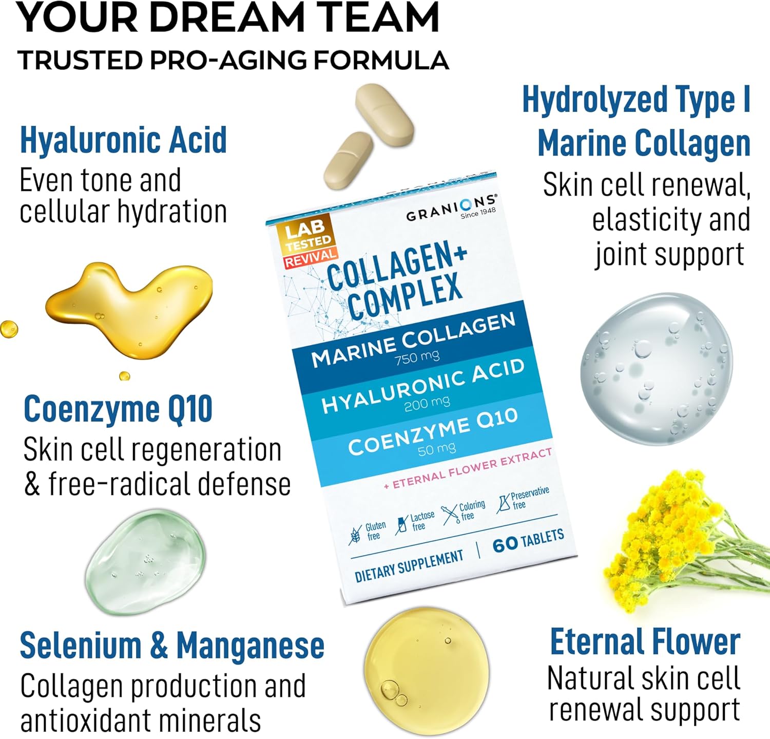 Marine Collagen Pills Complex – 200mg Hyaluronic Acid Supplement, Coenzyme Q10 CoQ10, Hydrolyzed Marine Collagen Peptides, Eternal Flower Hydration, Age Defense Supplements - 60 Sealed Tablets