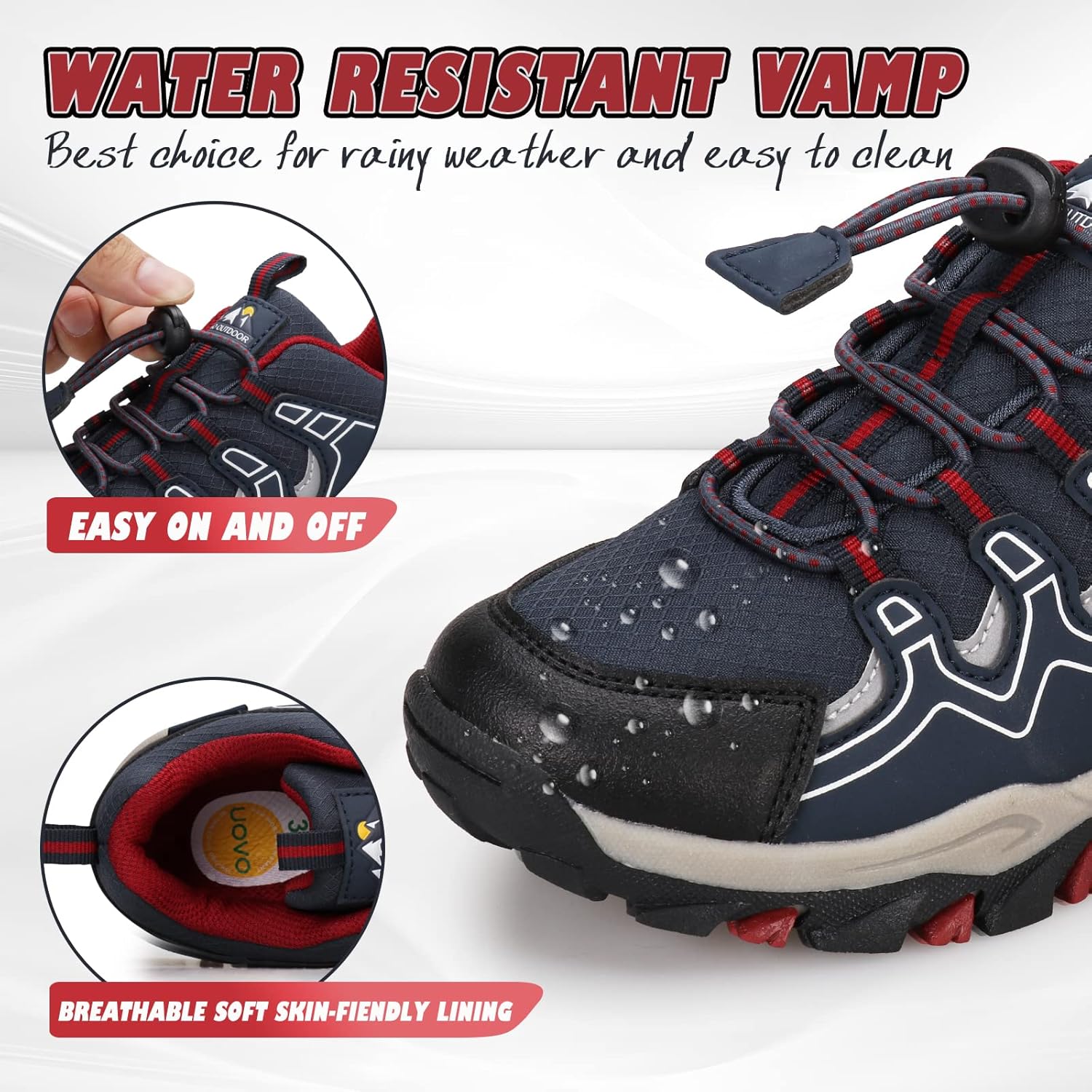• WATER REPELLENT VAMP - Kids waterproof shoes made with anti water splashing fabric ,allows kids to play at will, not to go out because of the rain.