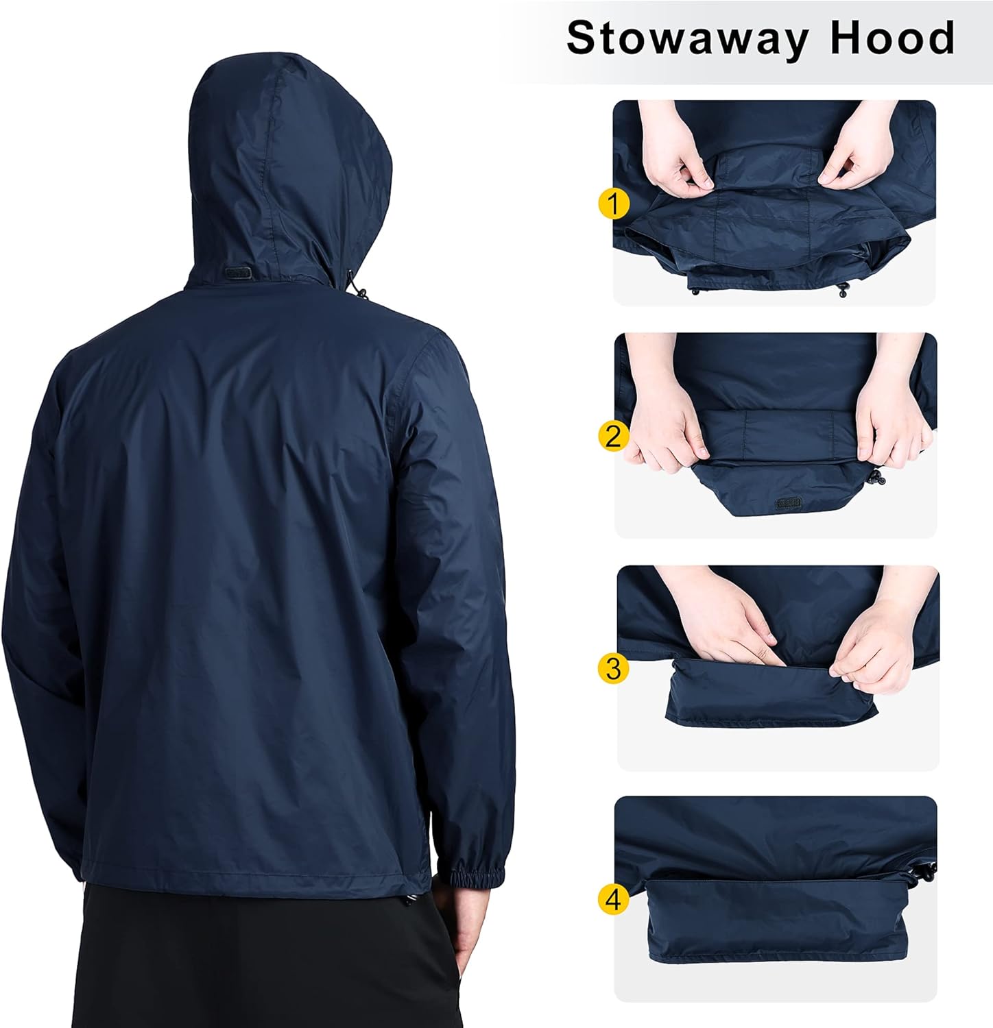 - 【Packable Ultralight Jacket】Men's rain jacket waterproof is super lightweight, with packable carrying pouch, easy to keep in your handbag, travelling bag, suitcase or car. It's intelligently designed to allow minimal space occupation.