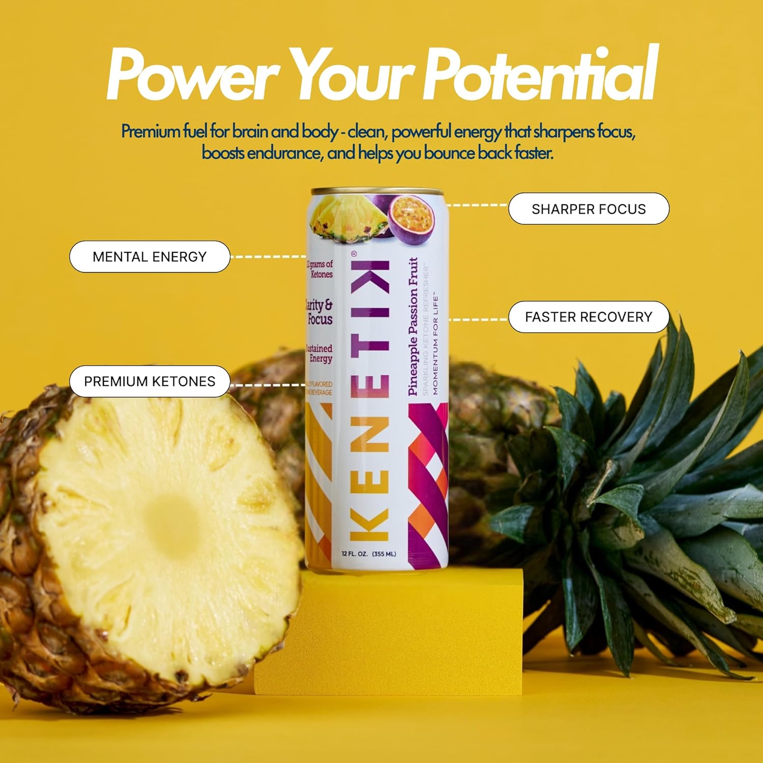 KENETIK Nootropic Ketone Drink, Ketones for Energy & Focus, Caffeine & Sugar Free, High Performance D-BHB Ketone Mix, Fuel w/Zero Crash or Jitters, Ready to Drink - Pineapple Passionfruit 12 Pk