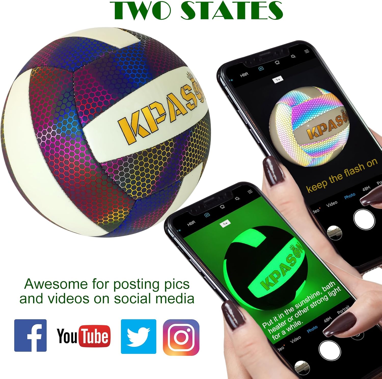 - SPECTACULAR HOLOGRAPHIC & GLOW IN THE DARK VOLLEYBALL -- Our holographic volleyball is made of a new generation of durable reflective PU leather and eco-friendly high-grade fluorescent glow PU leather, which makes the volleyball has a bright holographic effect when light shine on the ball and can also glow in the dark after absorbing energy from sunshine or other strong light sources.