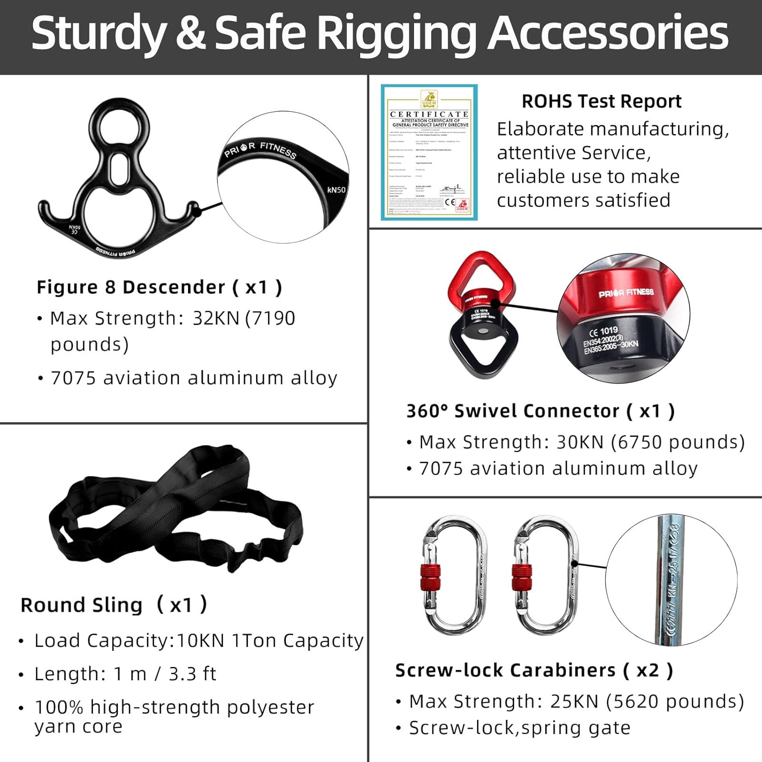 - 【Safety Tested & Guarantee】Aerial Silk is CE certified, SGS tested and recommended by certified aerial yoga teachers, Figure 8 Descender rated up to 32KN (7190pounds), 360°Swivel Connector (EN Certified) rated up to 30KN(6750 pounds), Daisy Chain Straps rated up to 10KN(2248 pounds),Screw-lock Carabiners (CE & EN Certified) rated up to 25KN(5620 pounds)